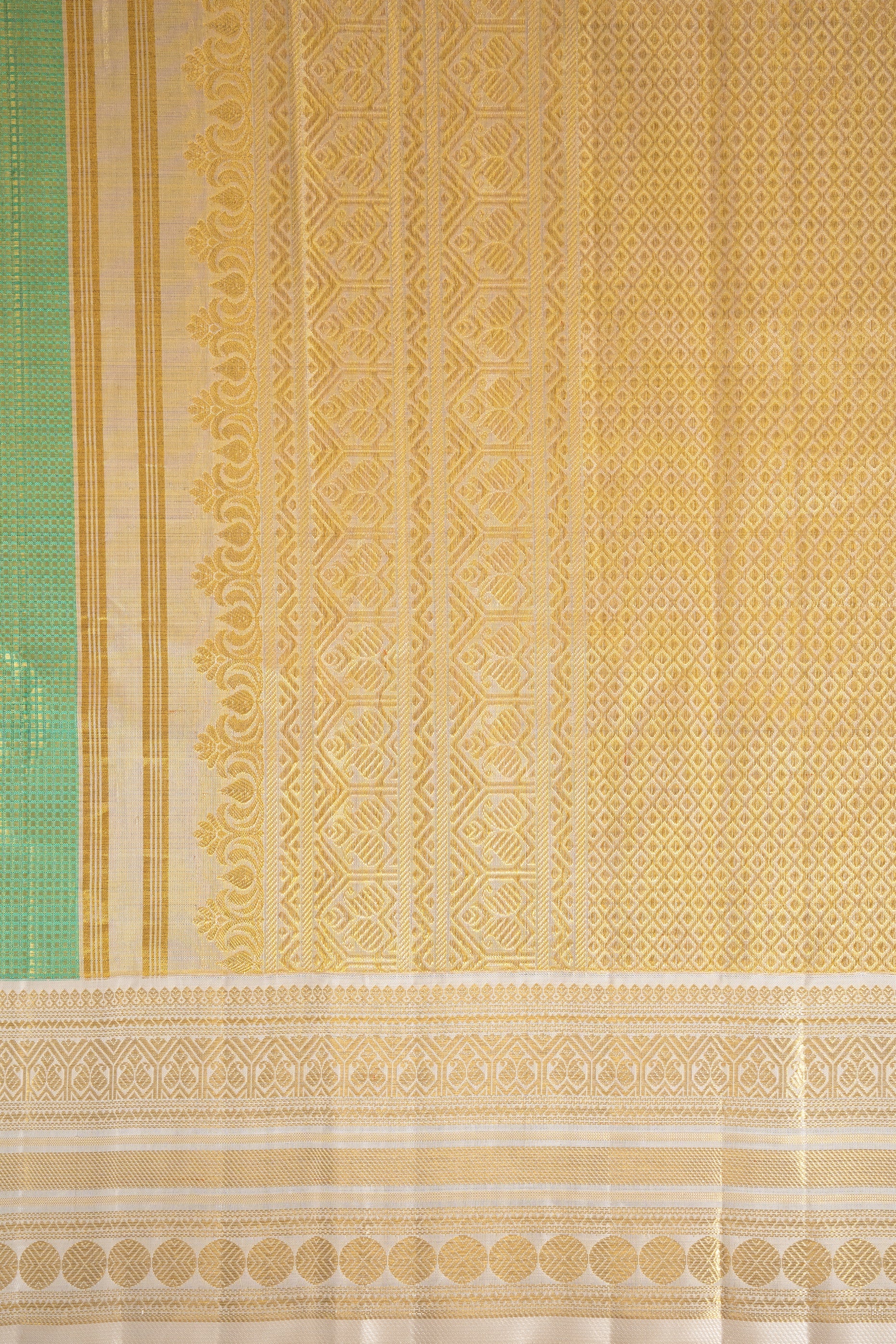 A Korvai green saree, woven with masterful craftsmanship. This piece is defined by its Jangula weaving technique, adding texture and artistry to its fabric. The border is crafted with 2-ply silk warp and weft, ensuring durability and an enhanced drape.