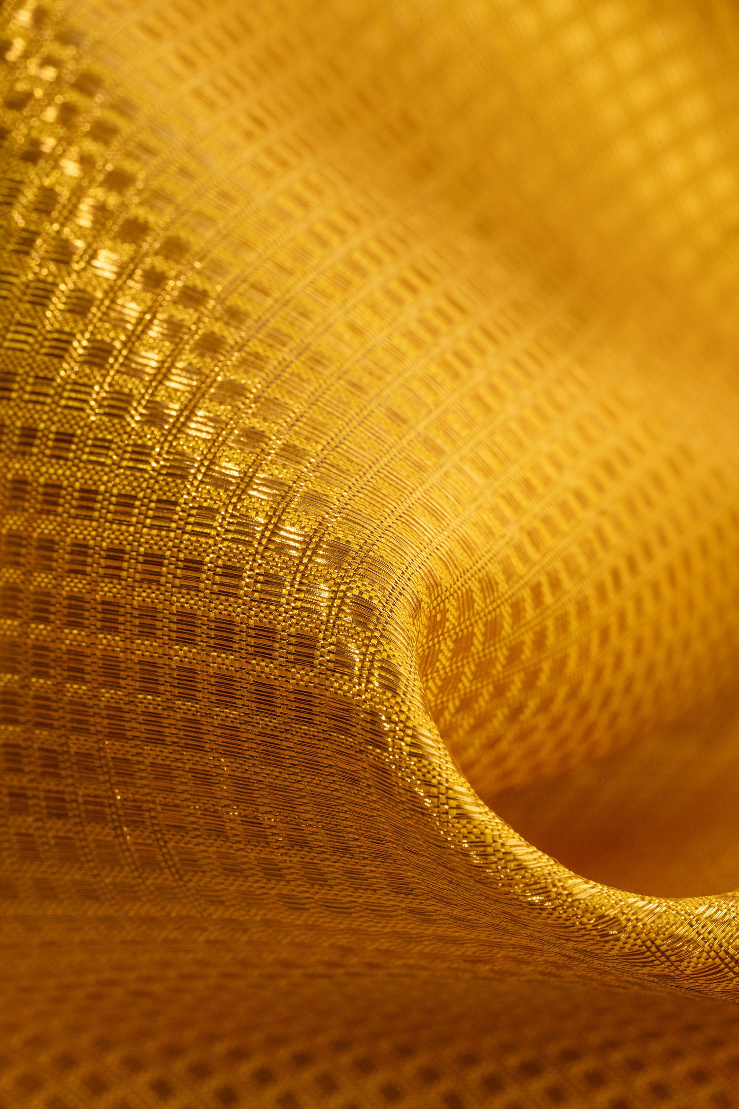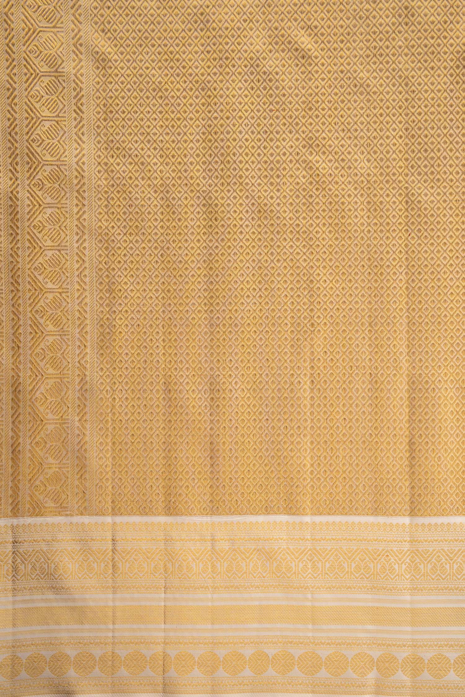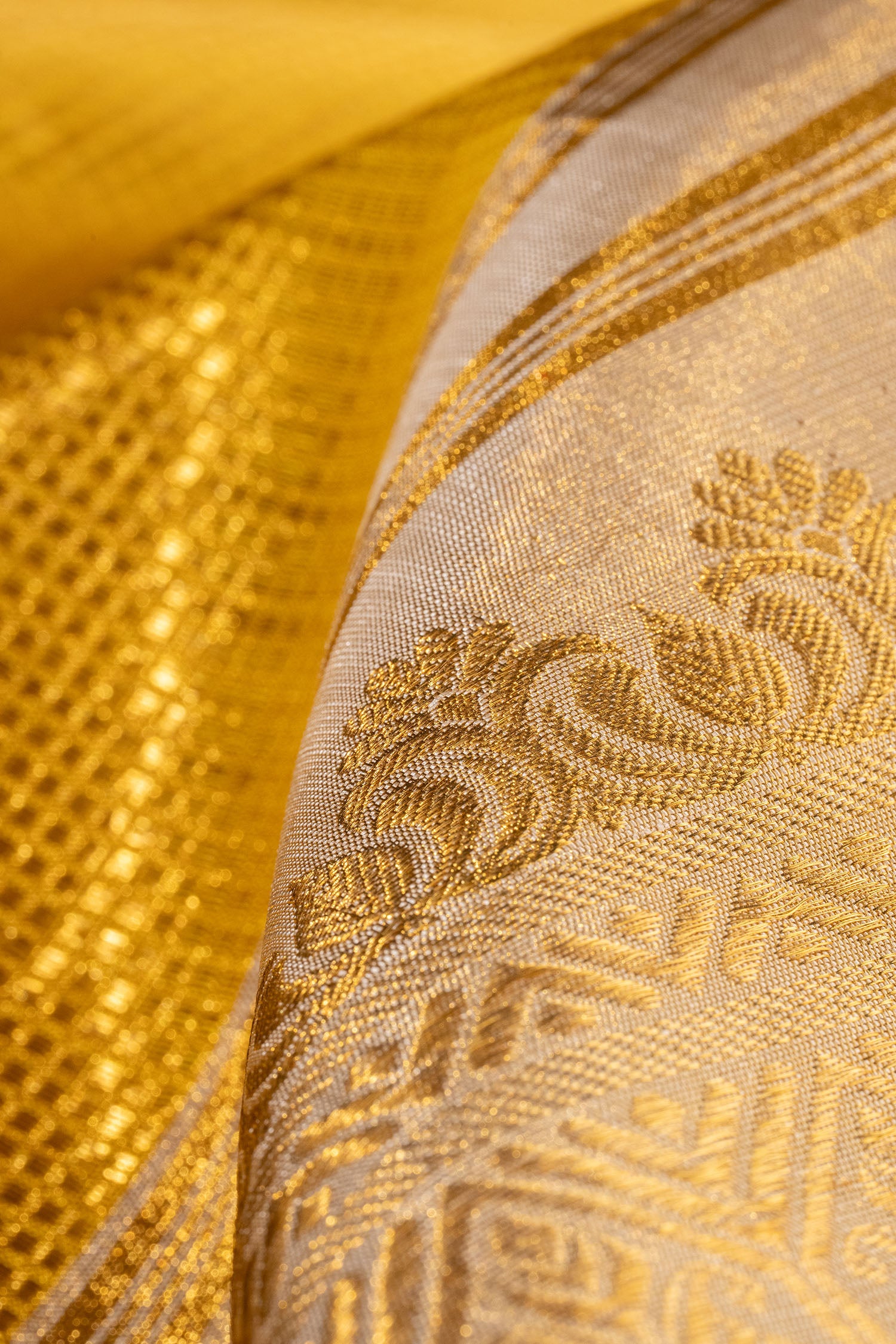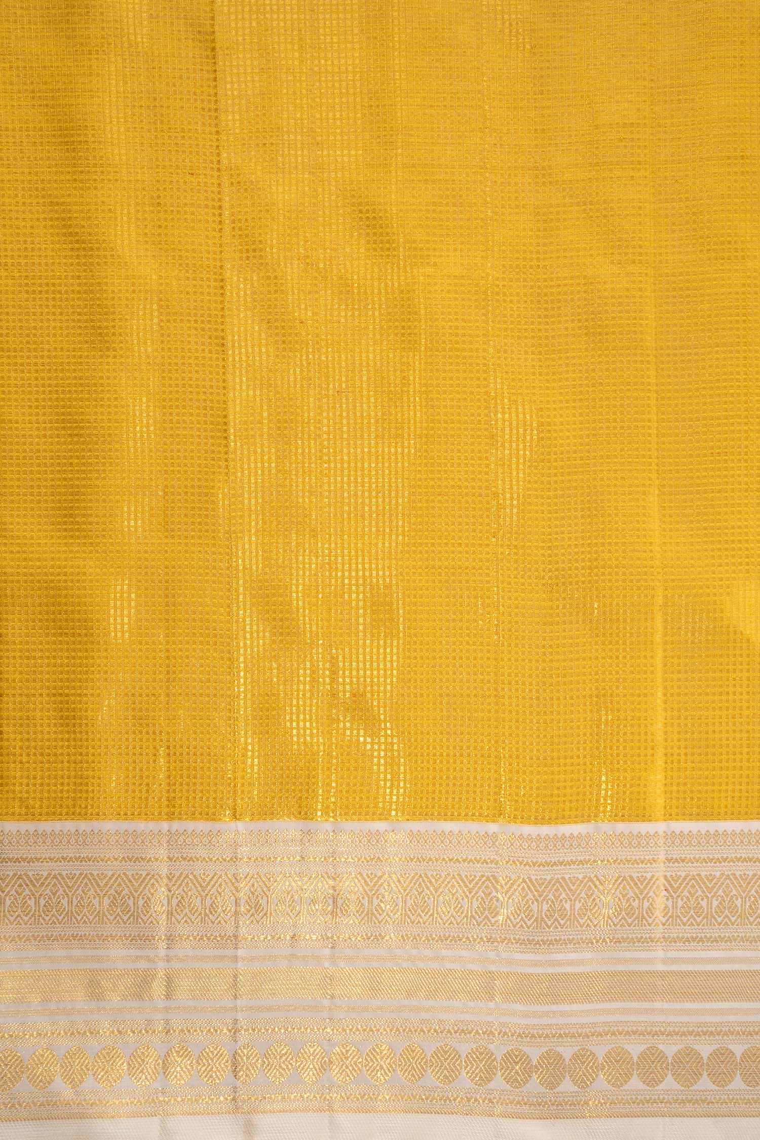 A radiant Korvai yellow saree, glowing with the warmth of tradition and artistry. The depth of the Jangula weave brings out the richness of the fabric, while the contrast of the Korvai technique enhances its elegance.