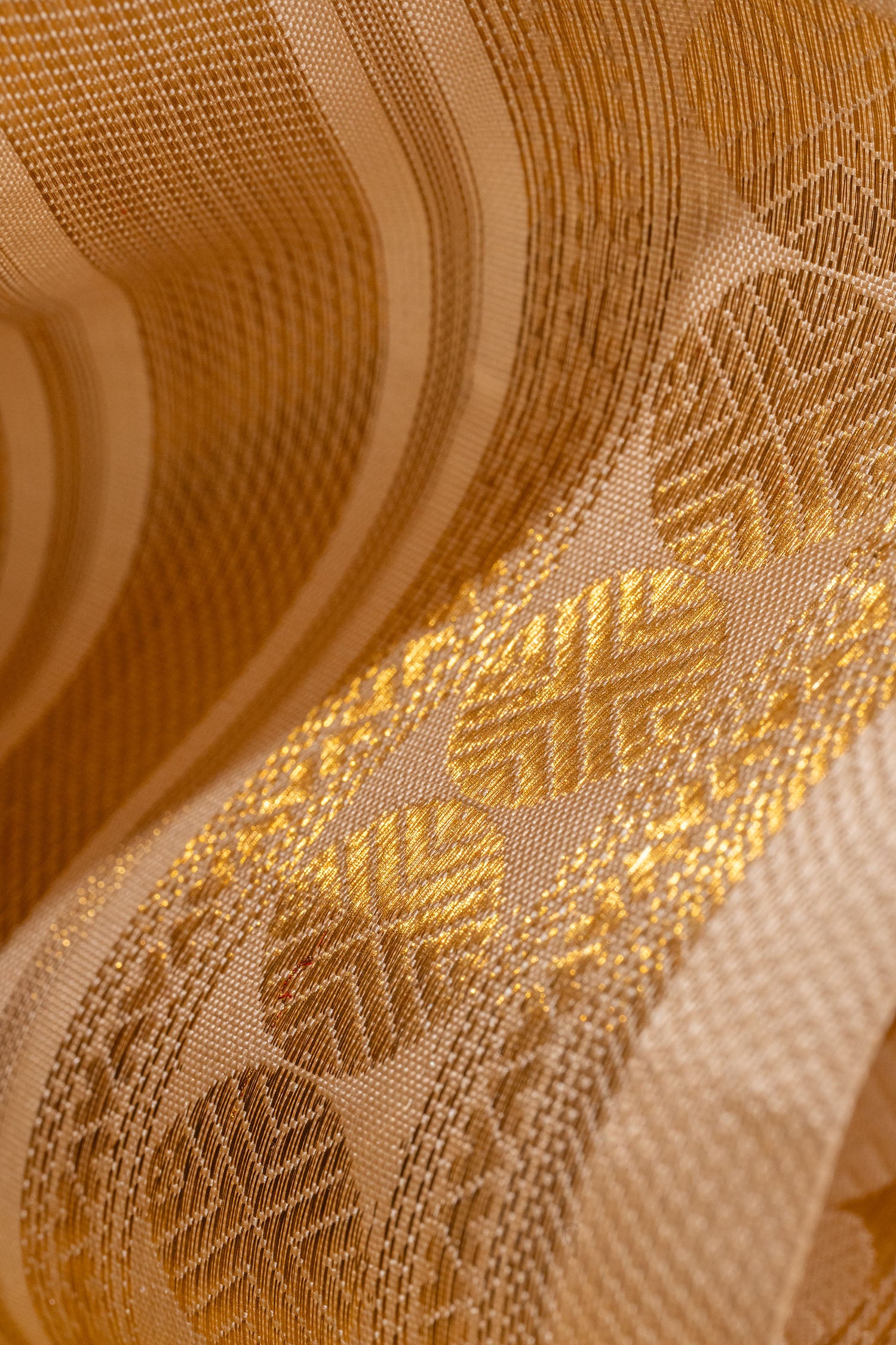 With a weight of 1 kg 100 gm and Gold zari work of 750 gm, this saree flows gracefully while holding its regal structure. The rich pallu completes its grandeur, making it an exquisite choice for celebrations.