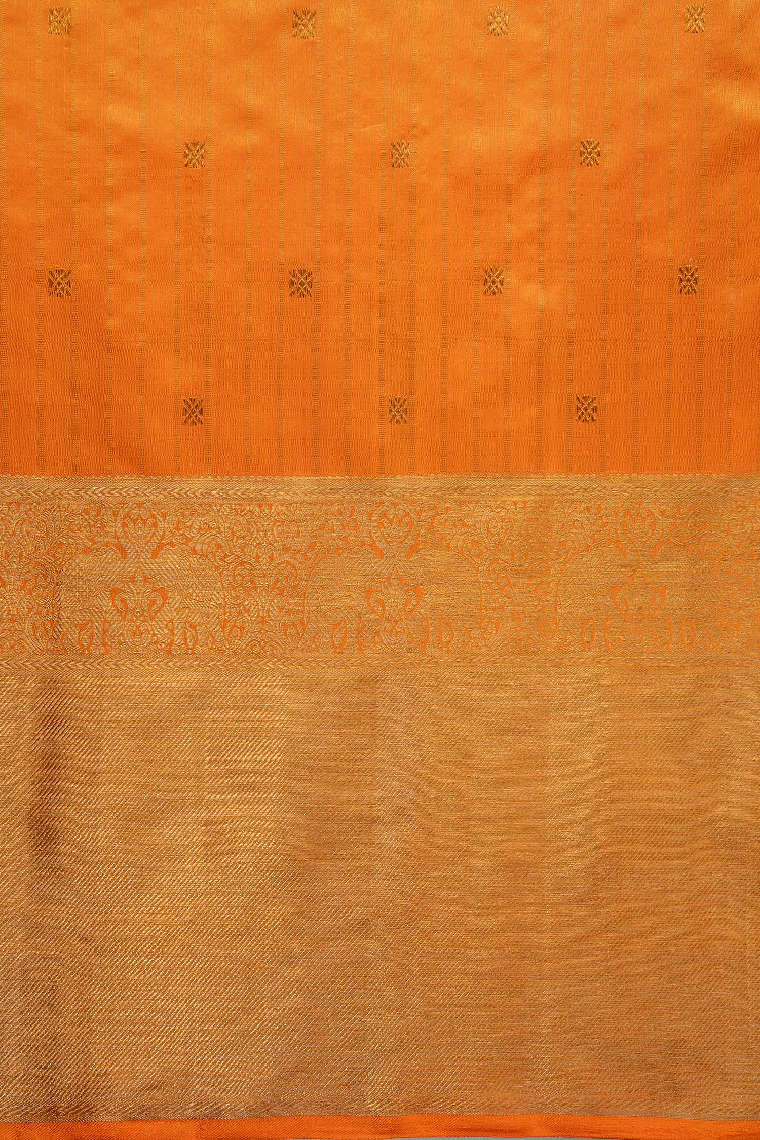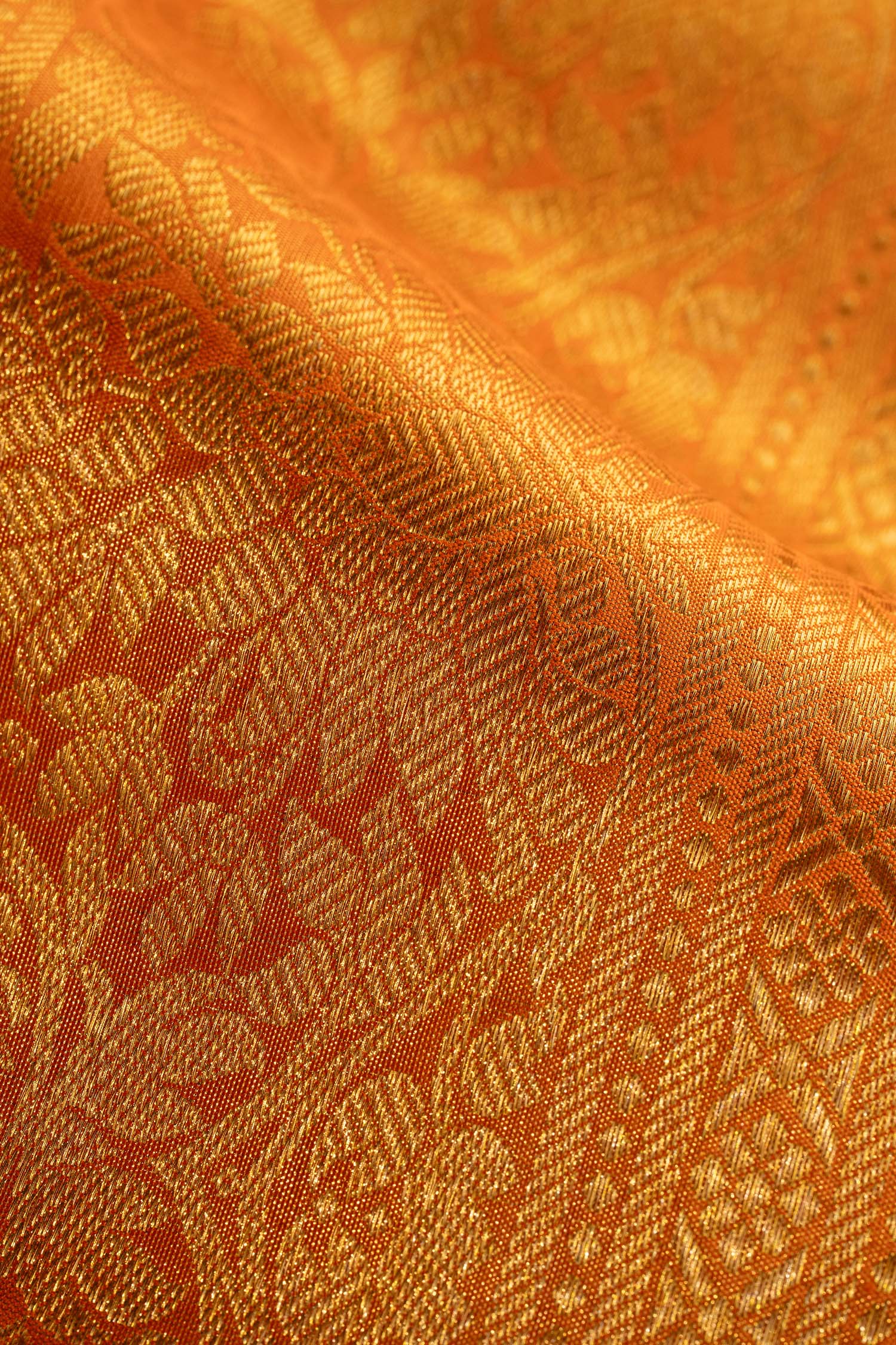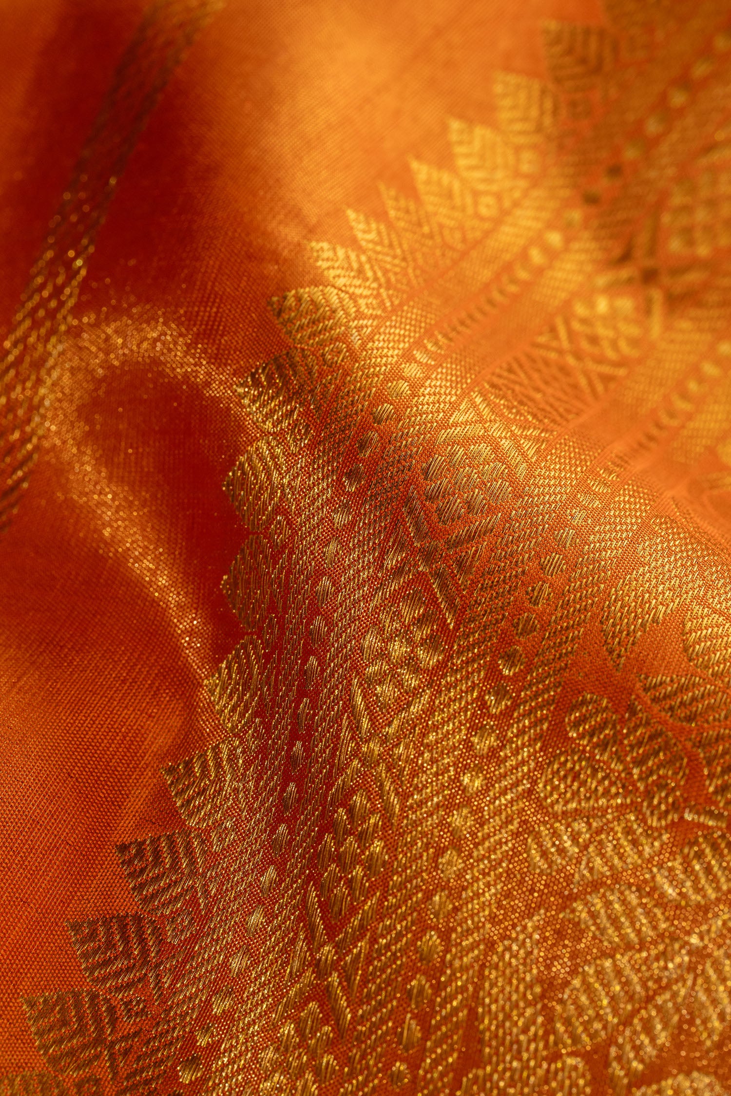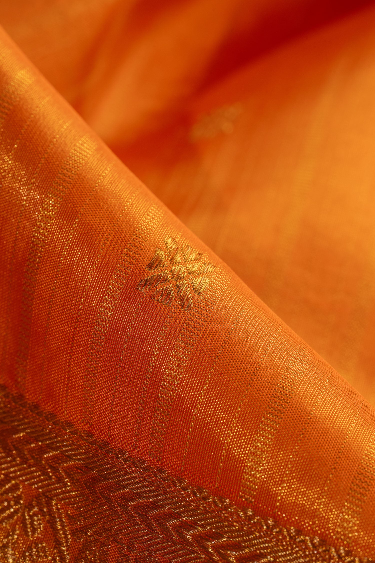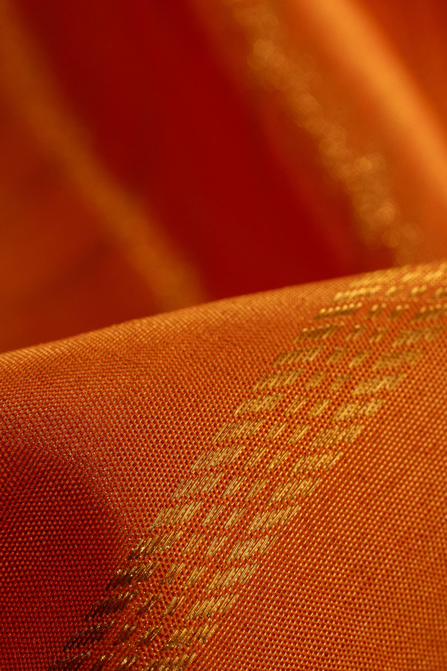 A bright orange saree, woven in evening and morning tissue butta weaving, blending vibrance with tradition. The body features Kamlam butta motifs, adding a layer of intricate detailing, while the rich pallu brings an element of sophistication.