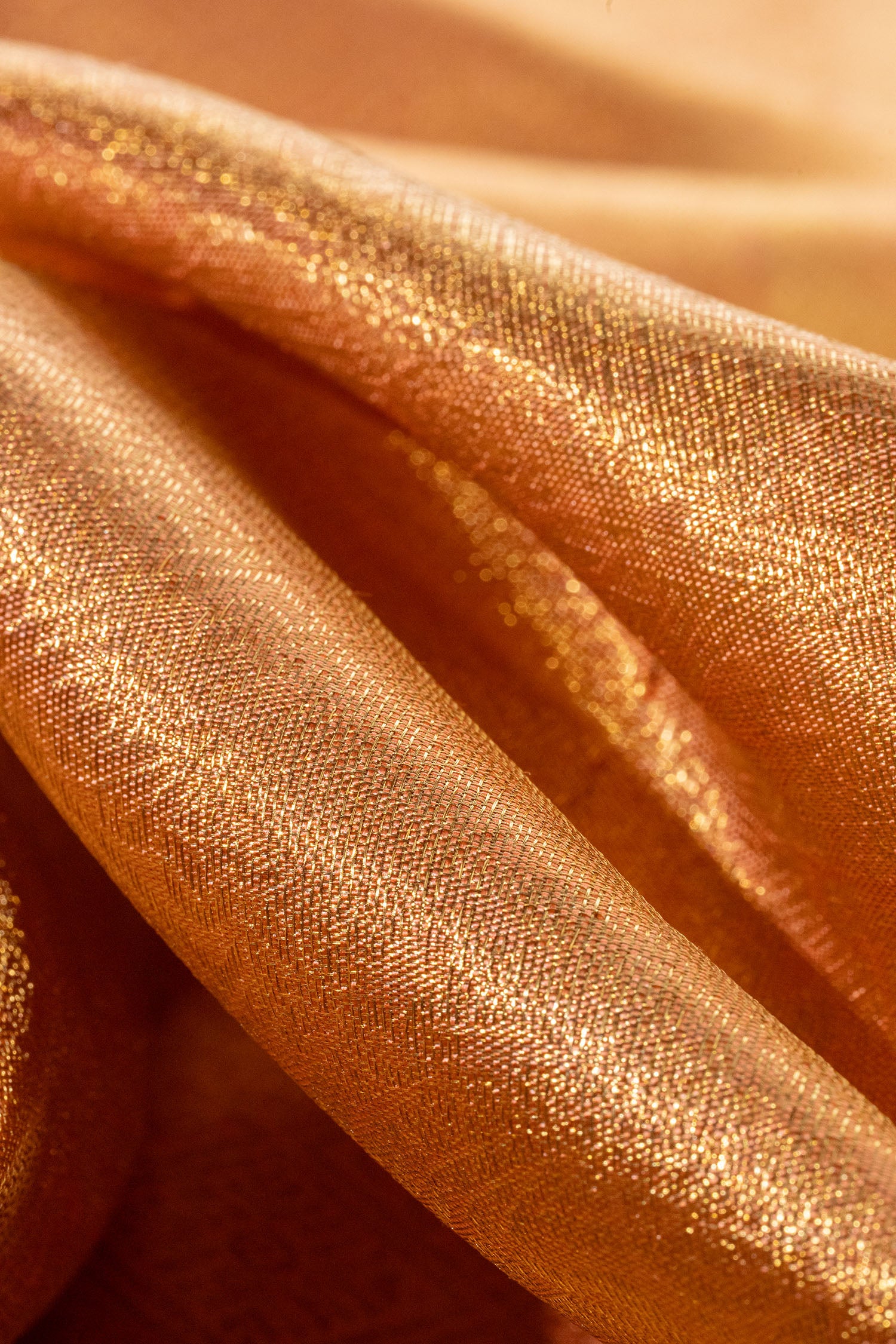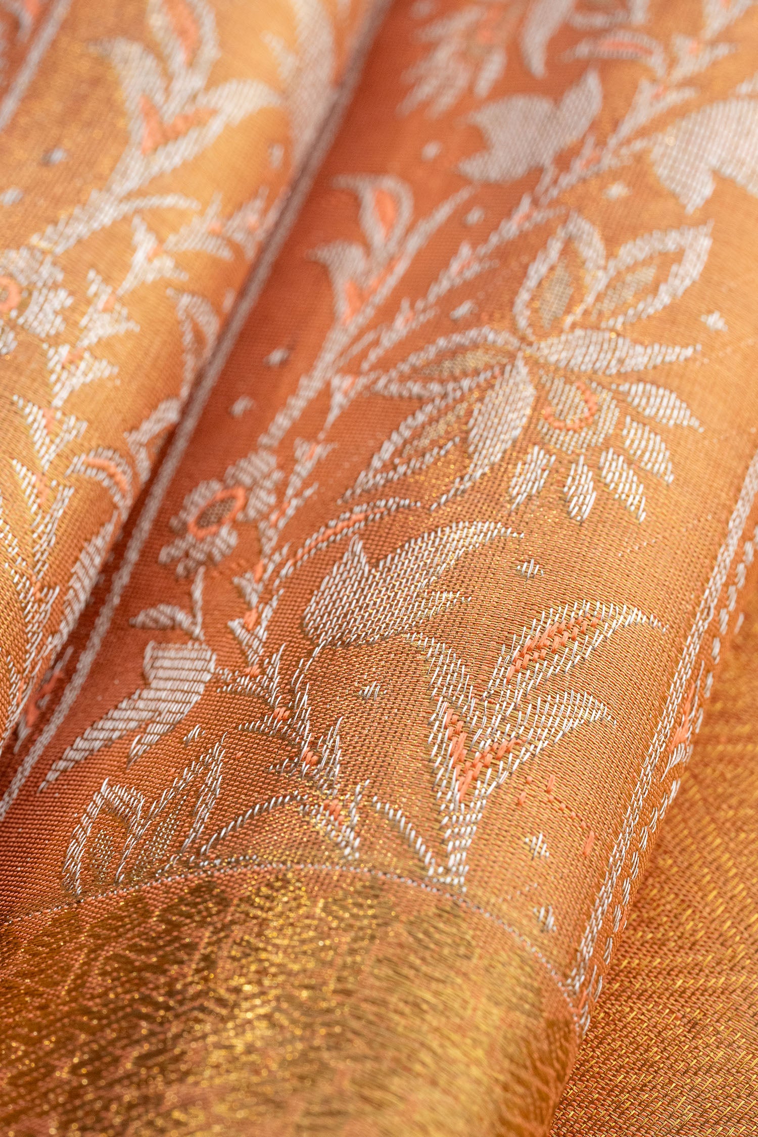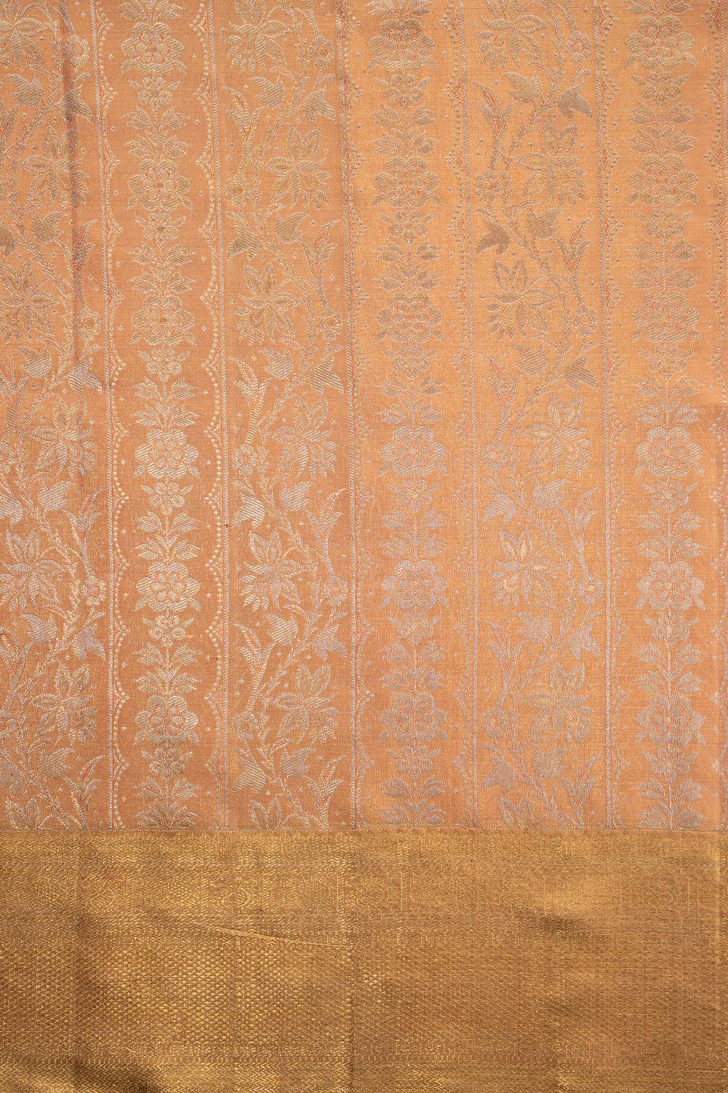 A peach saree, luminous and graceful, adorned with tissue silver brocade weaving.