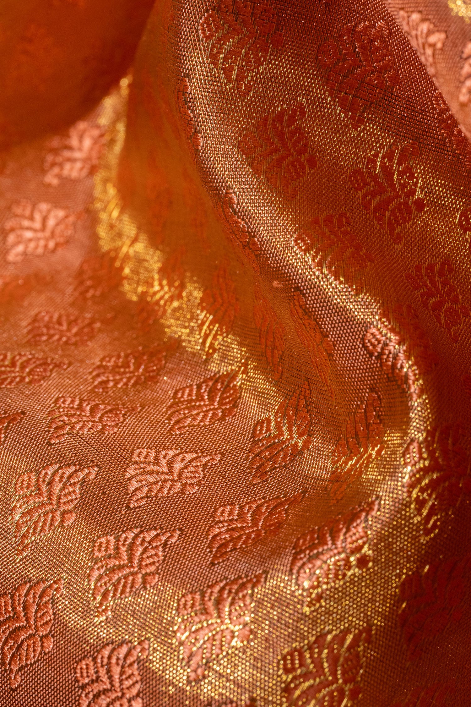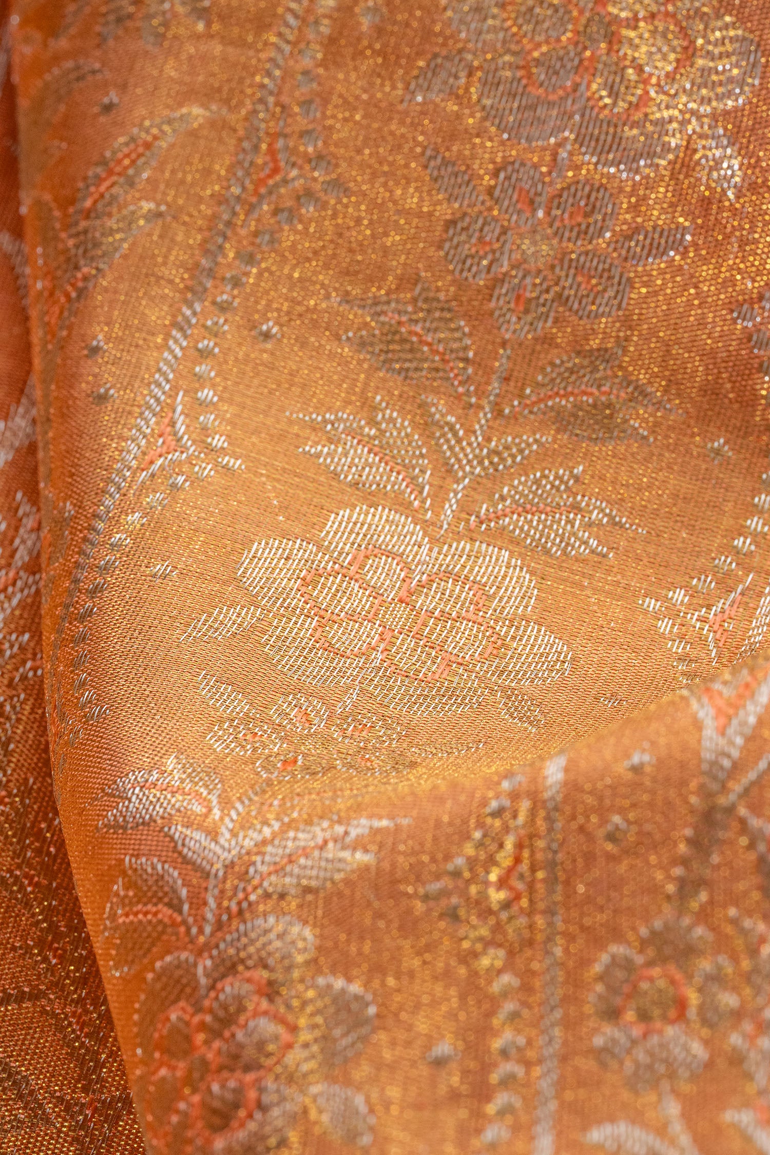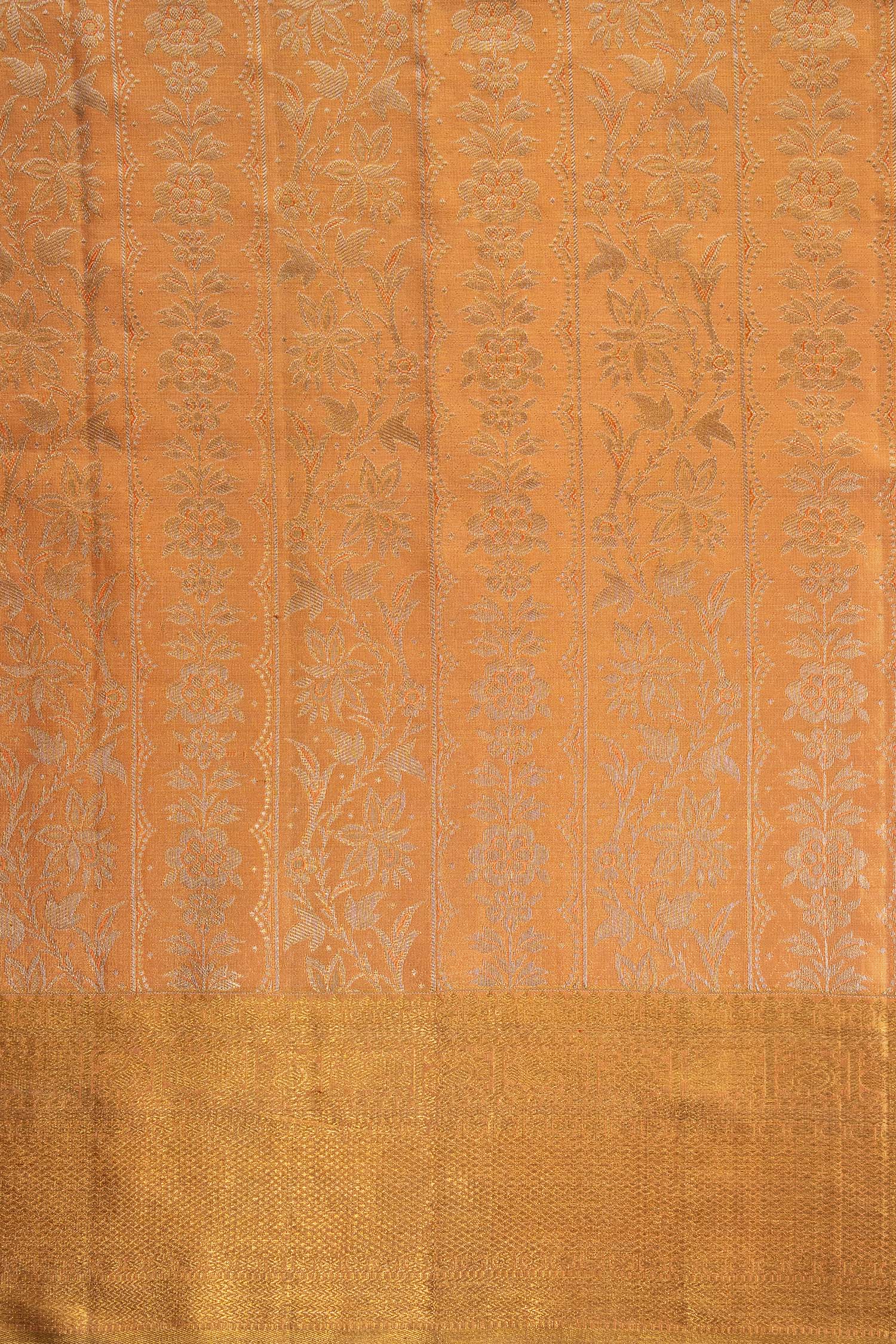 A peach saree, luminous and graceful, adorned with tissue silver brocade weaving.