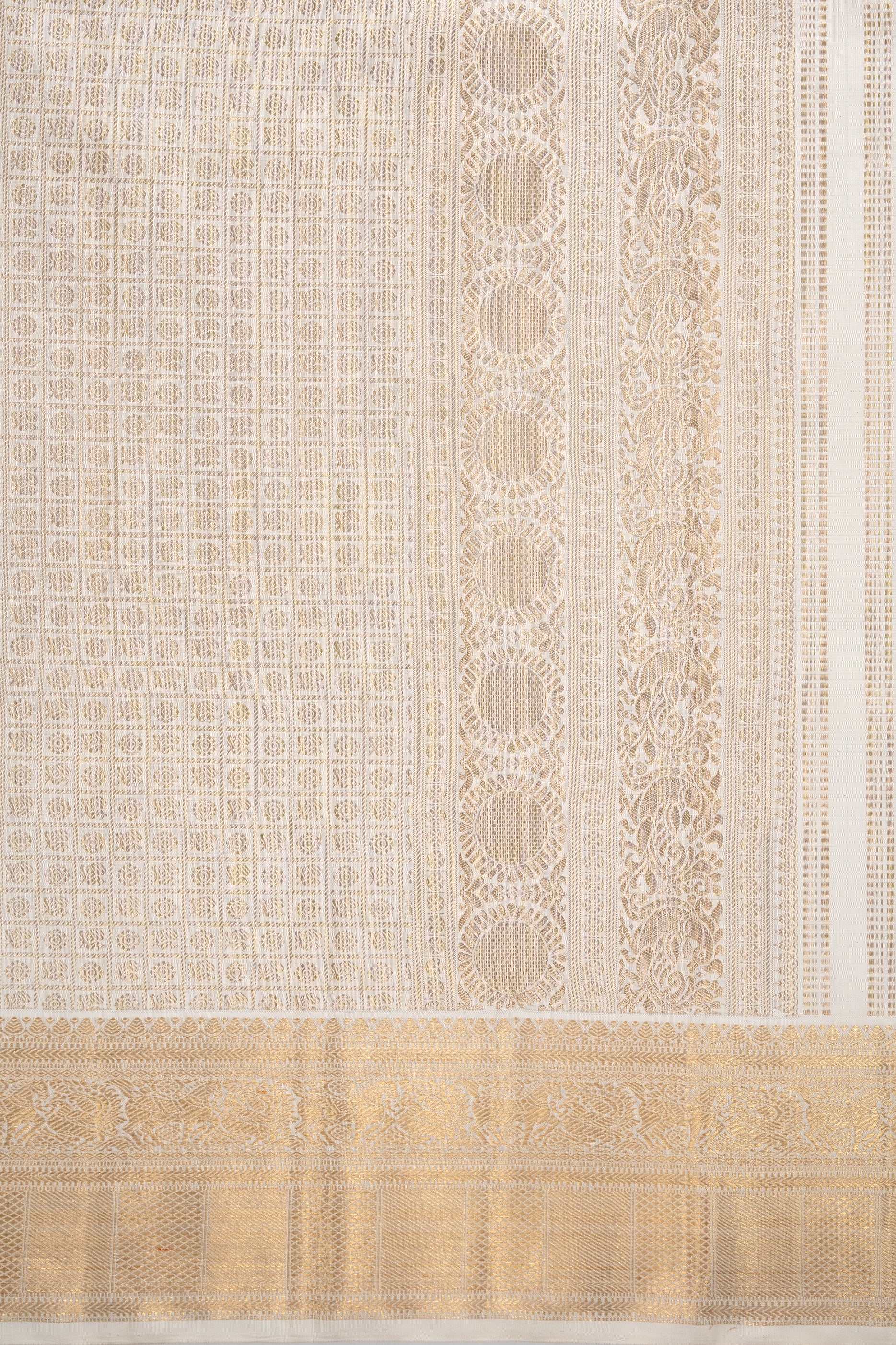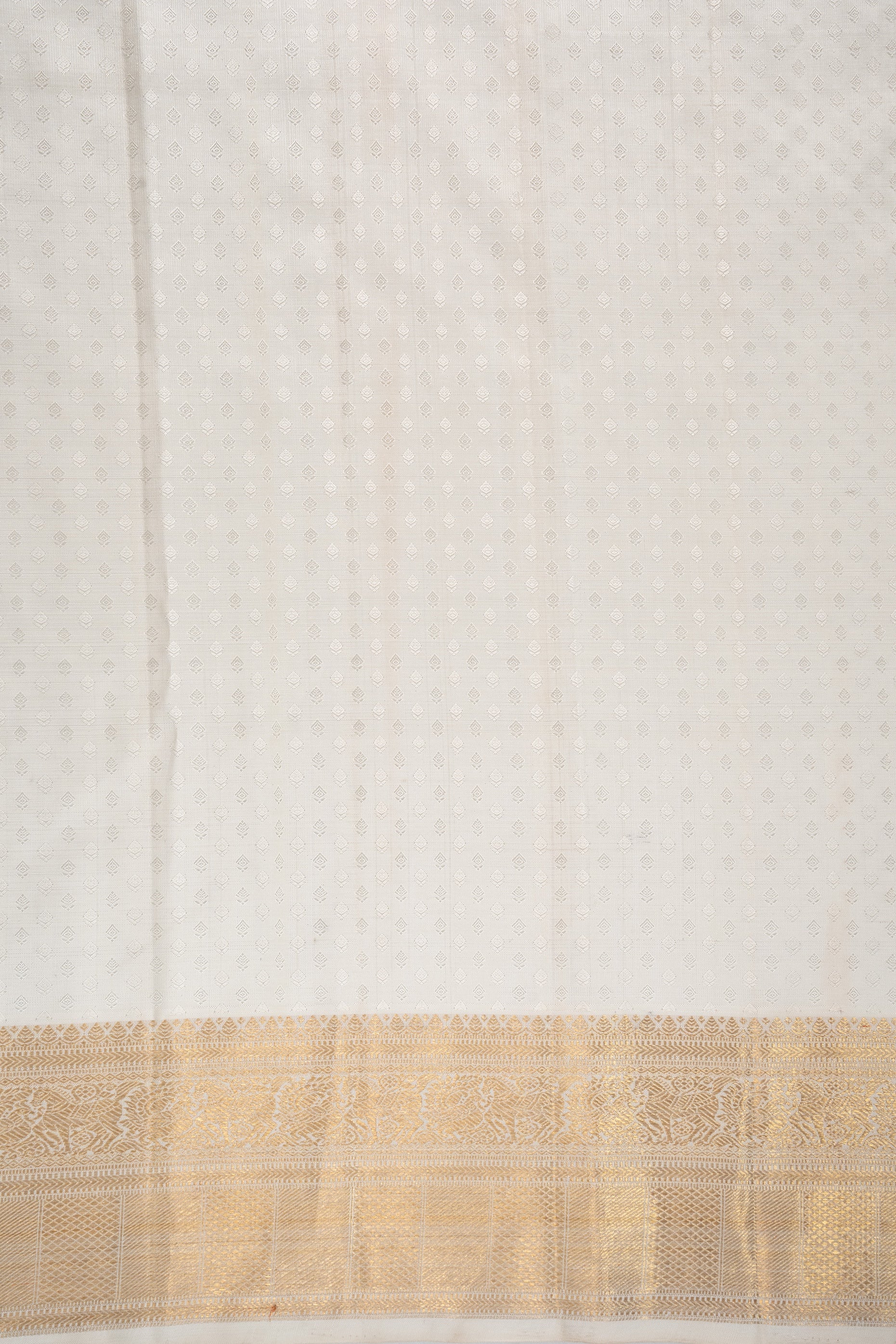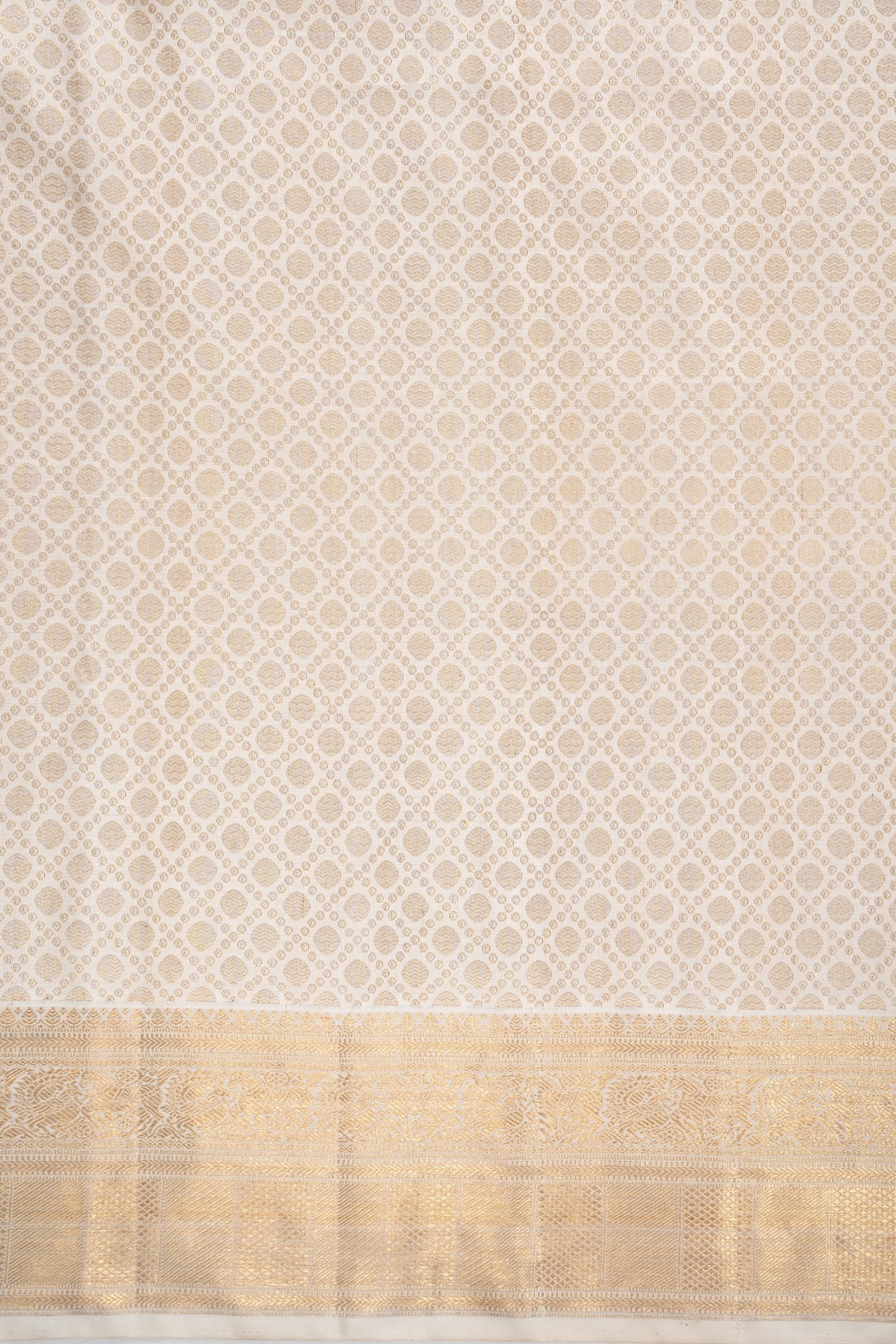 An off-white brocade saree, exuding a quiet elegance with its understated charm. The rich pallu, adorned with additional wept work and zari, adds depth and sophistication to its drape.