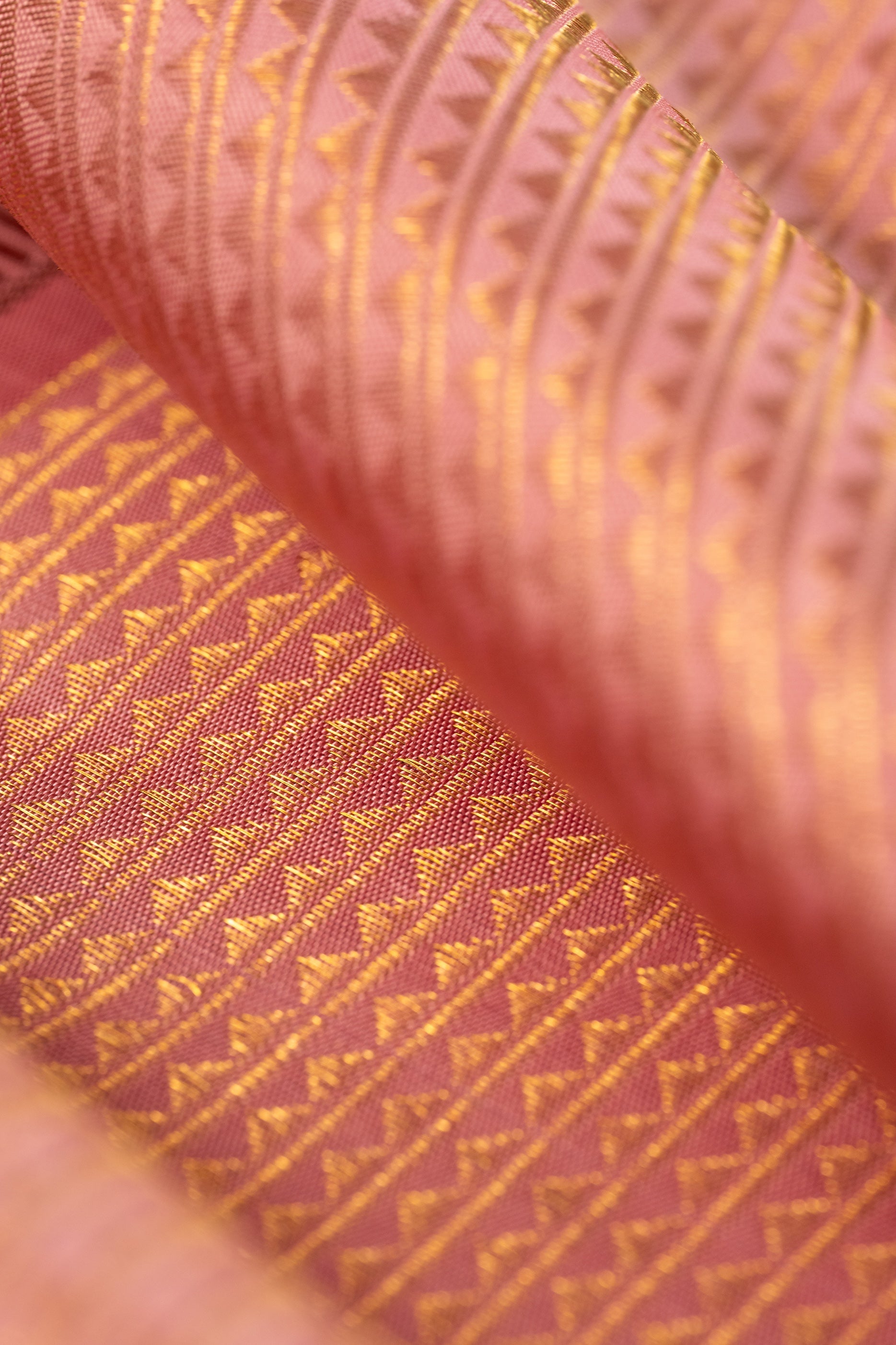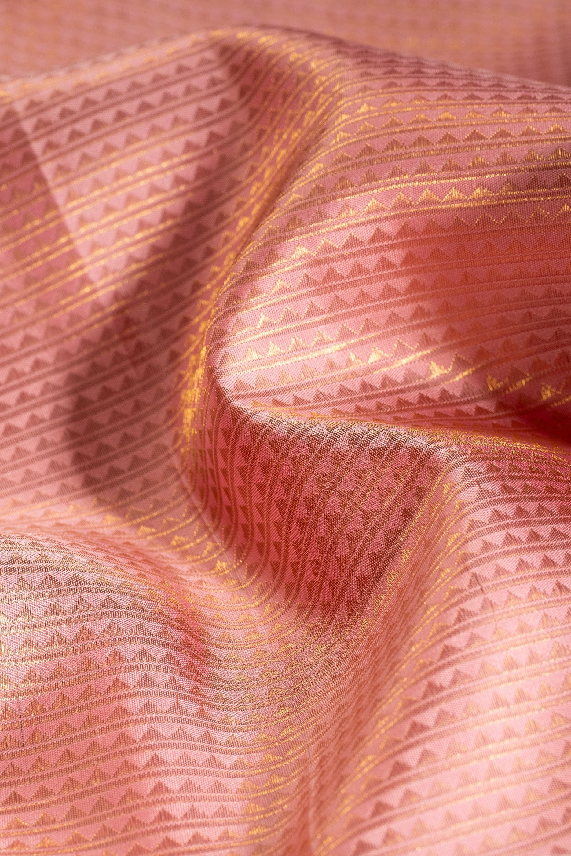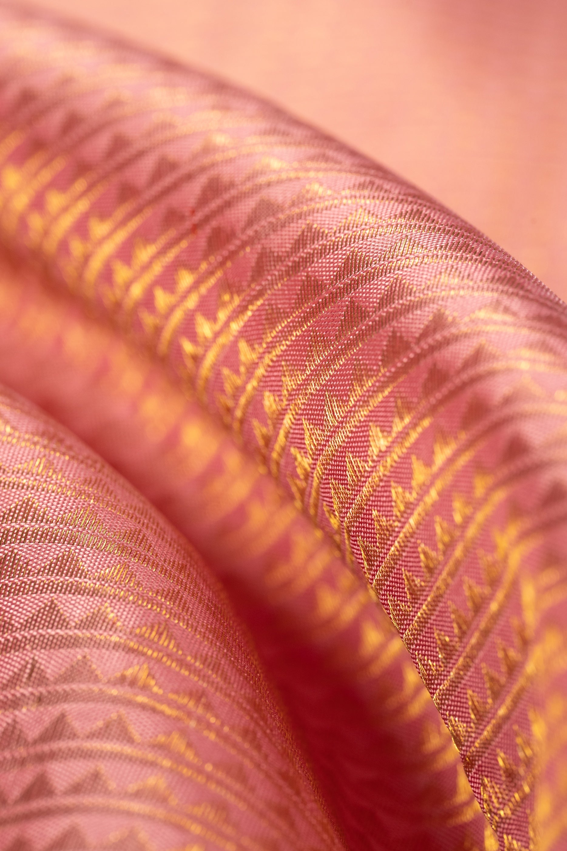 A pure pink saree, designed with the exquisite Aharamadam brocade weaving technique, blending tradition with modern grace. This evening and morning saree is adorned with fine pure zari work, adding a soft, luminous glow to its drape.