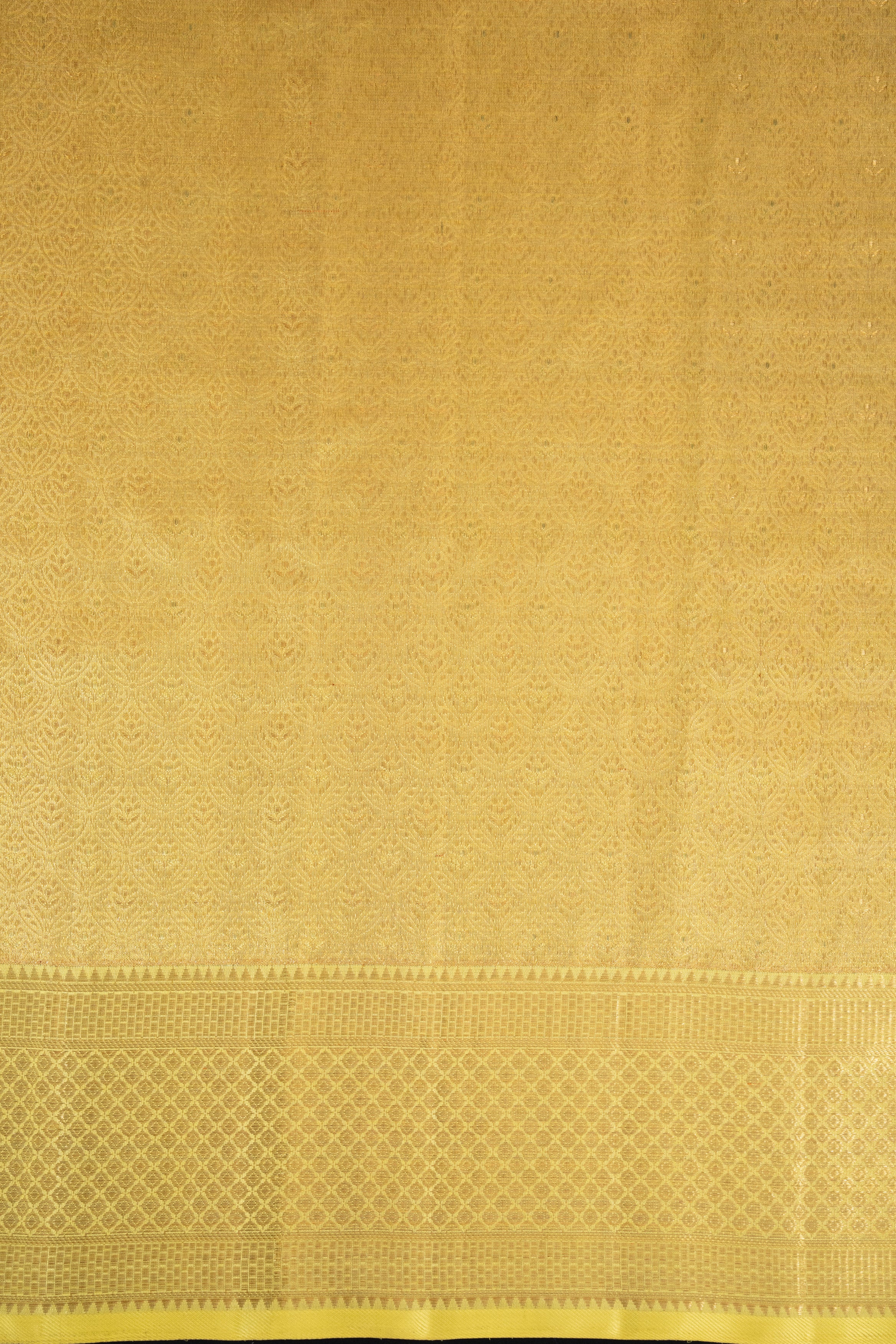 A refreshing light green saree, woven in tissue brocade, carrying the essence of nature’s elegance. The rich pallu, accentuated with additional wept zari, enhances the depth of the fabric, creating a graceful, flowing silhouette.