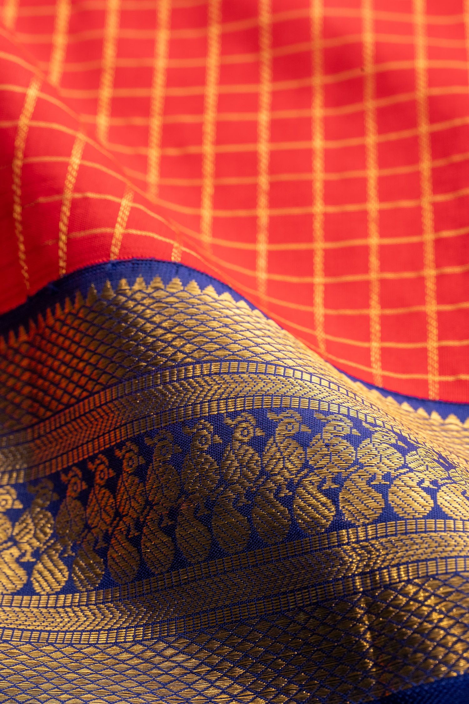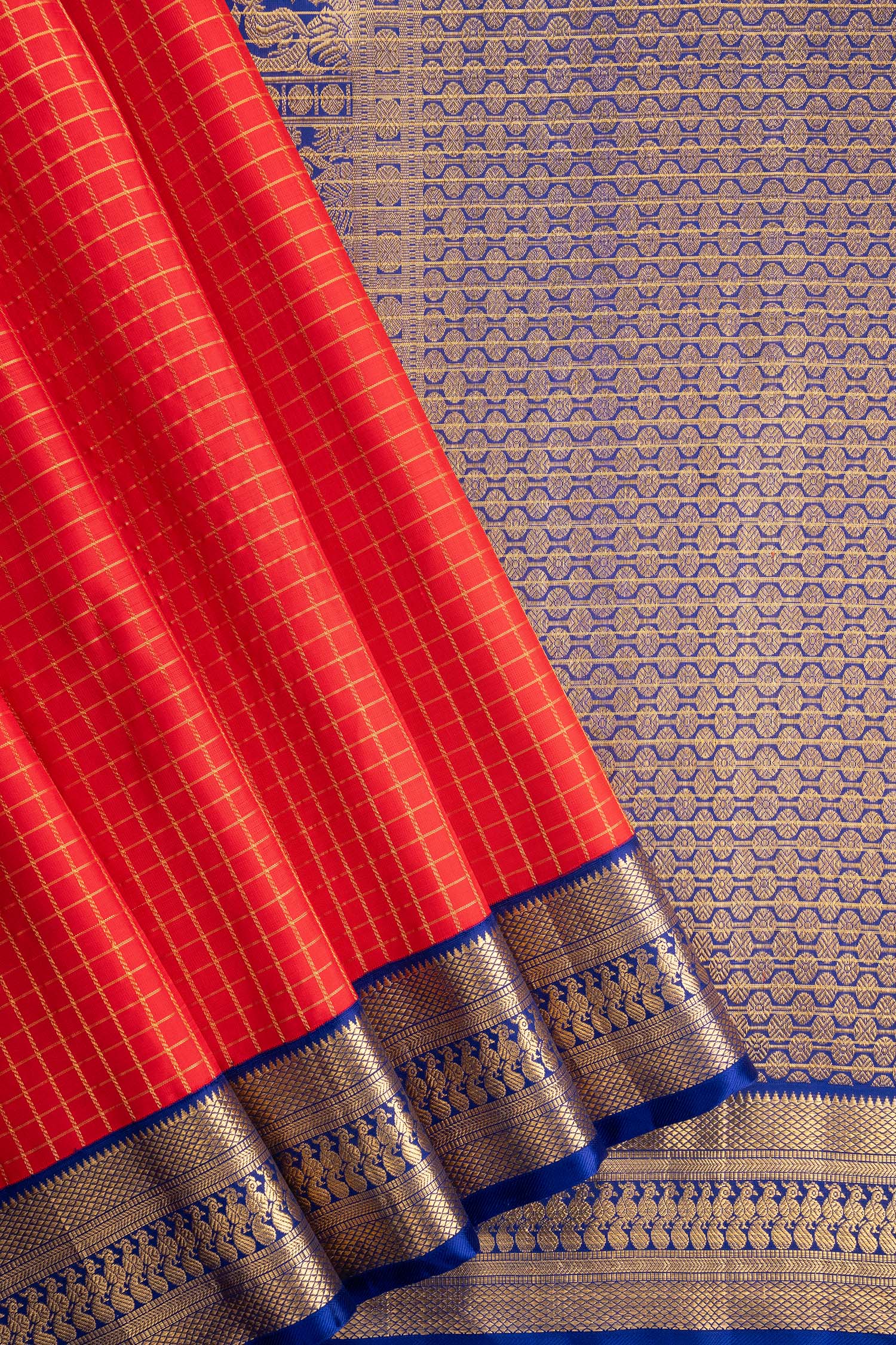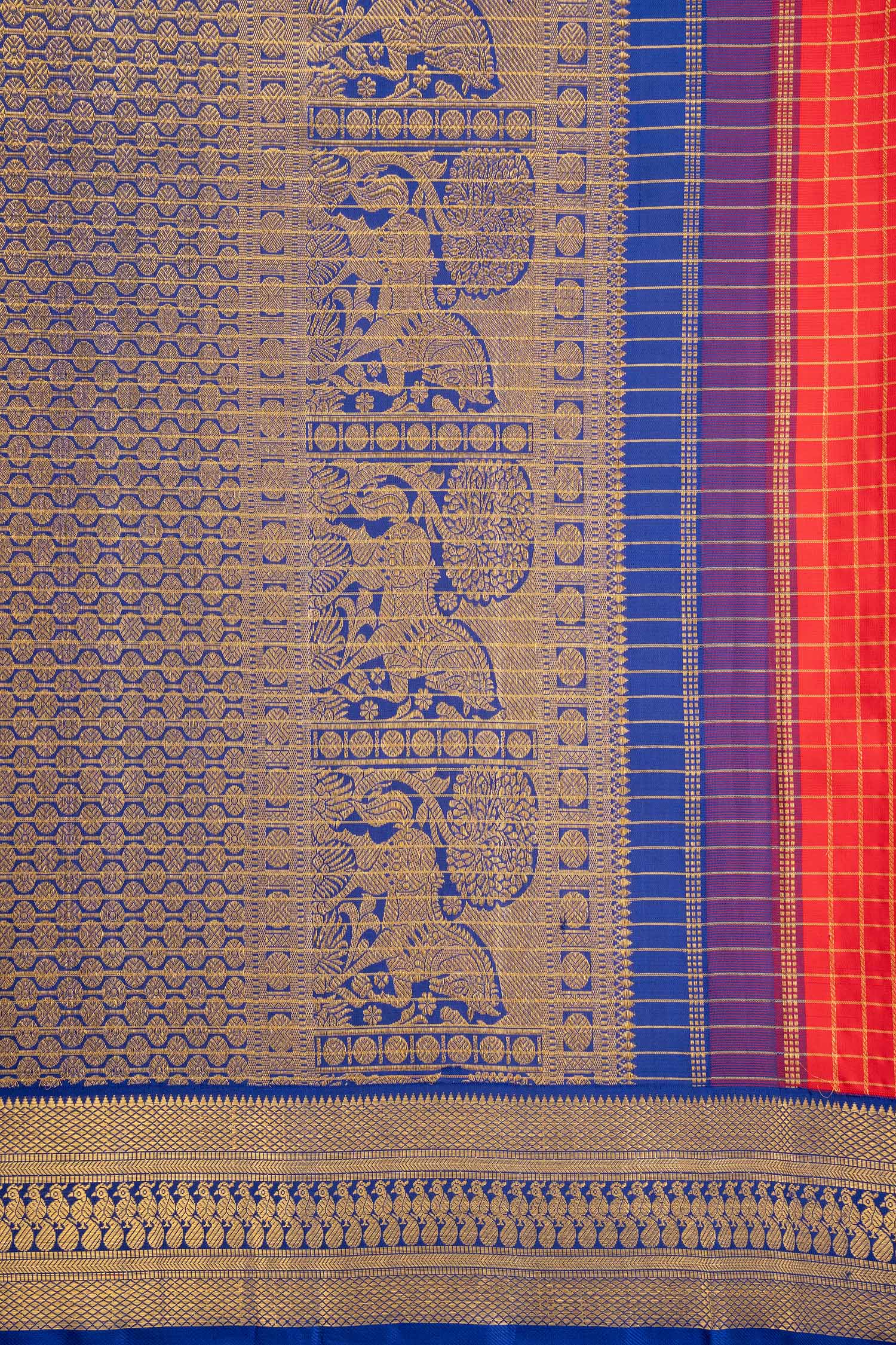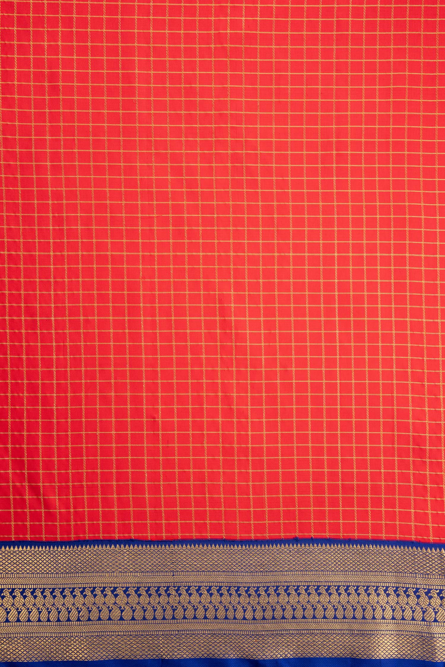 Handwoven by two artisans in the Muthukattam Korvai tradition, this saree is adorned with a body full of zari checks and a rich pallu. The contrast border and body colors add depth to its design, while the weight of 900 gm (silk) and 300 gm (Gold zari) ensures an elegant drape that feels as beautiful as it looks.