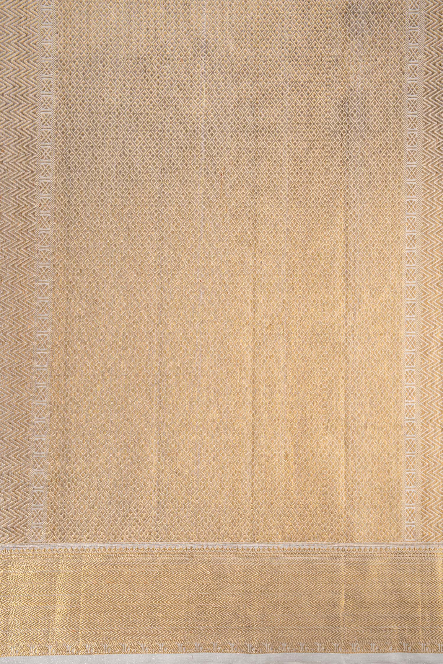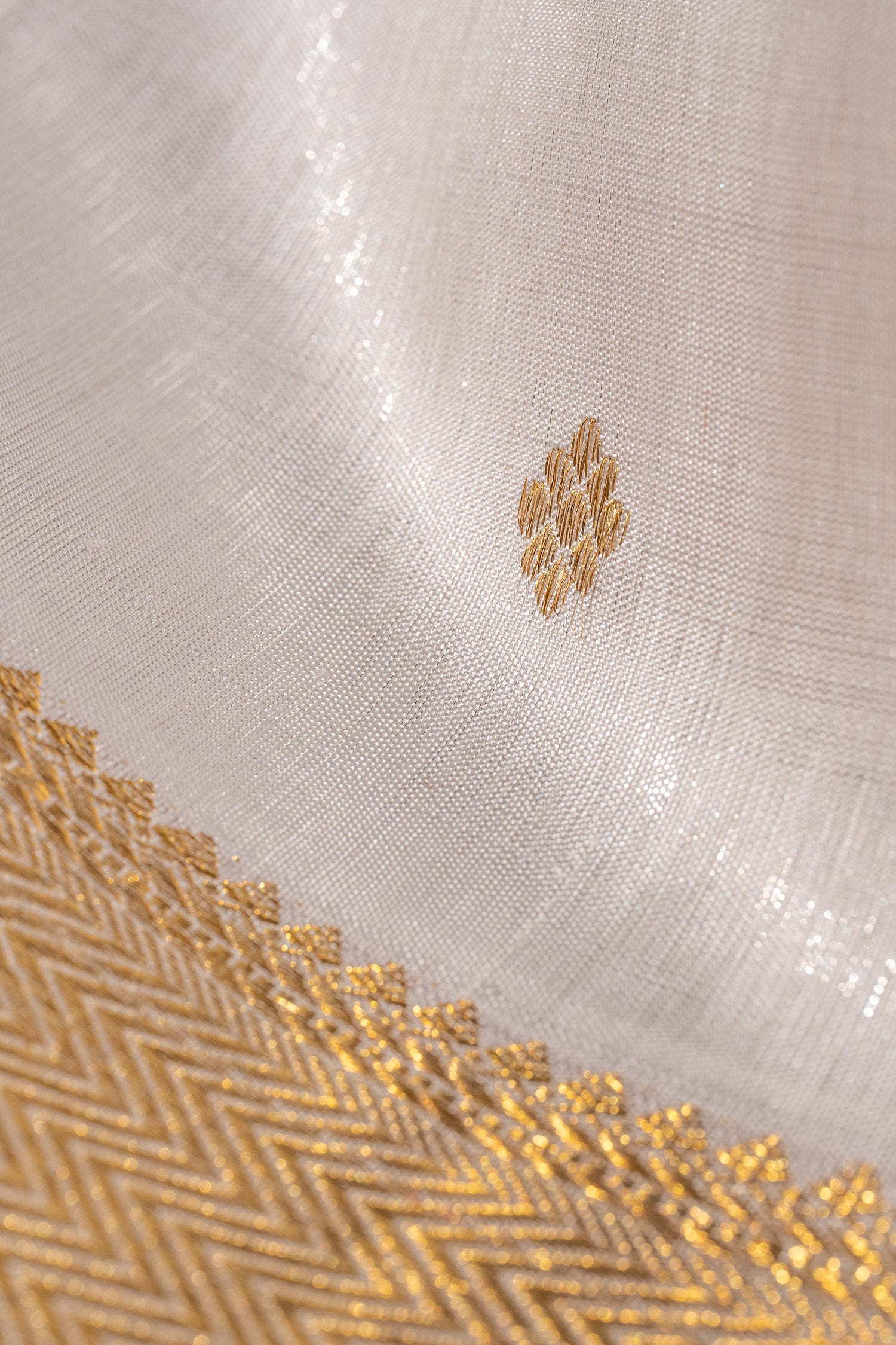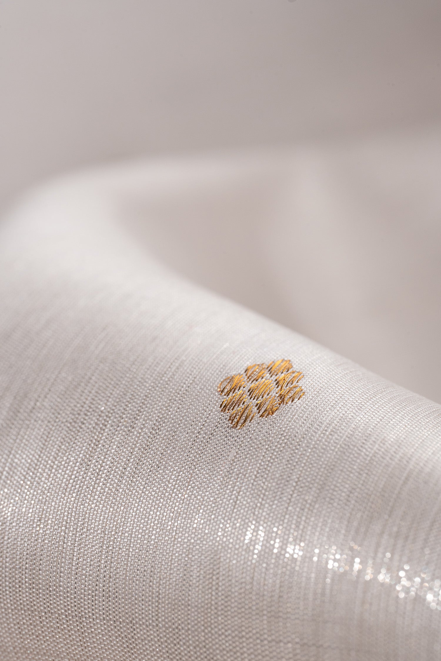 A saree bathed in soft silver hues, this piece radiates the quiet brilliance of timeless artistry. The half-tissue silk weave allows for a graceful shimmer, perfect for those who appreciate subtle grandeur.