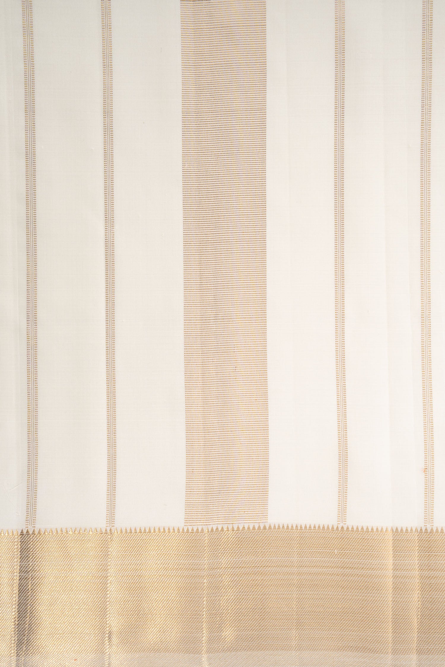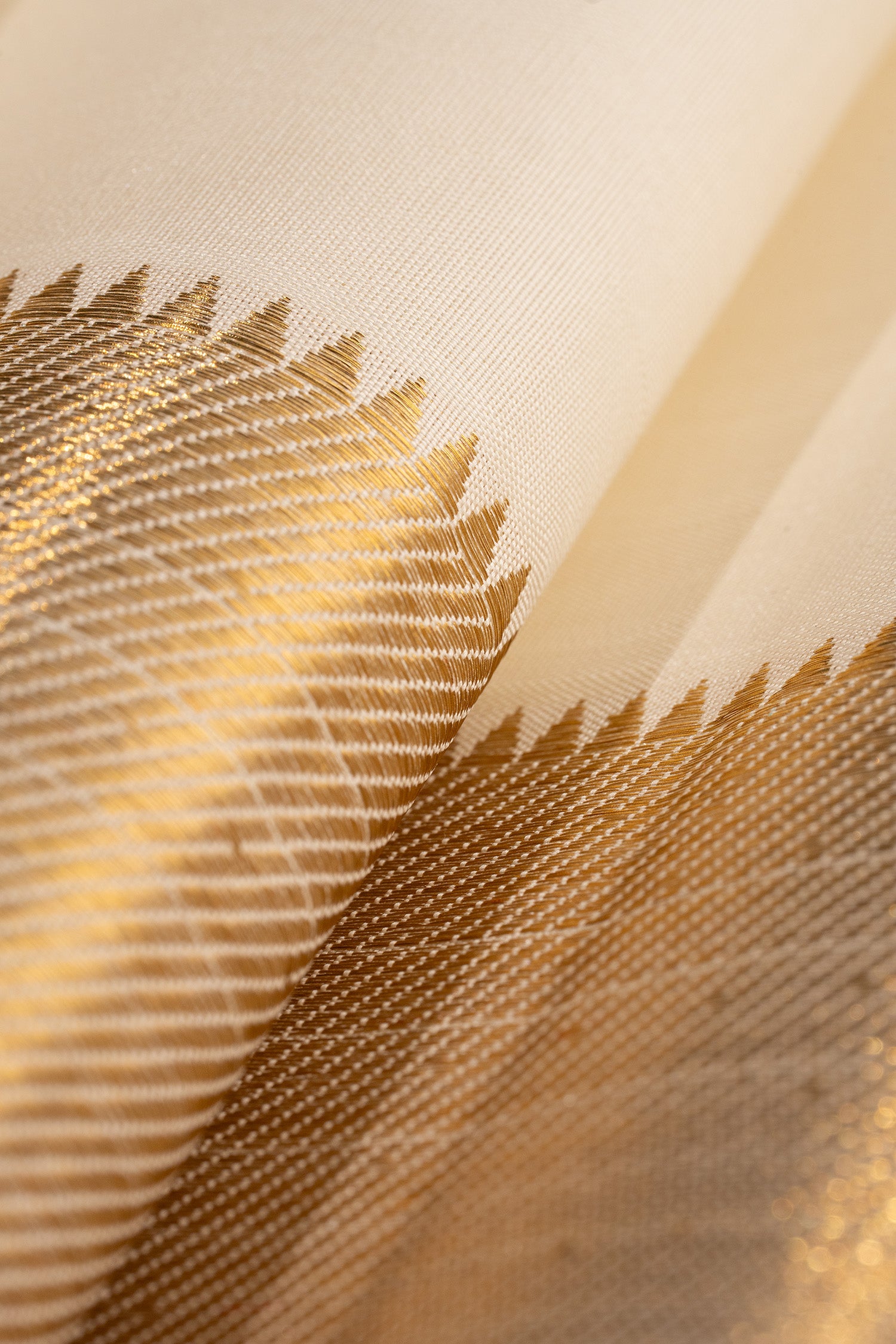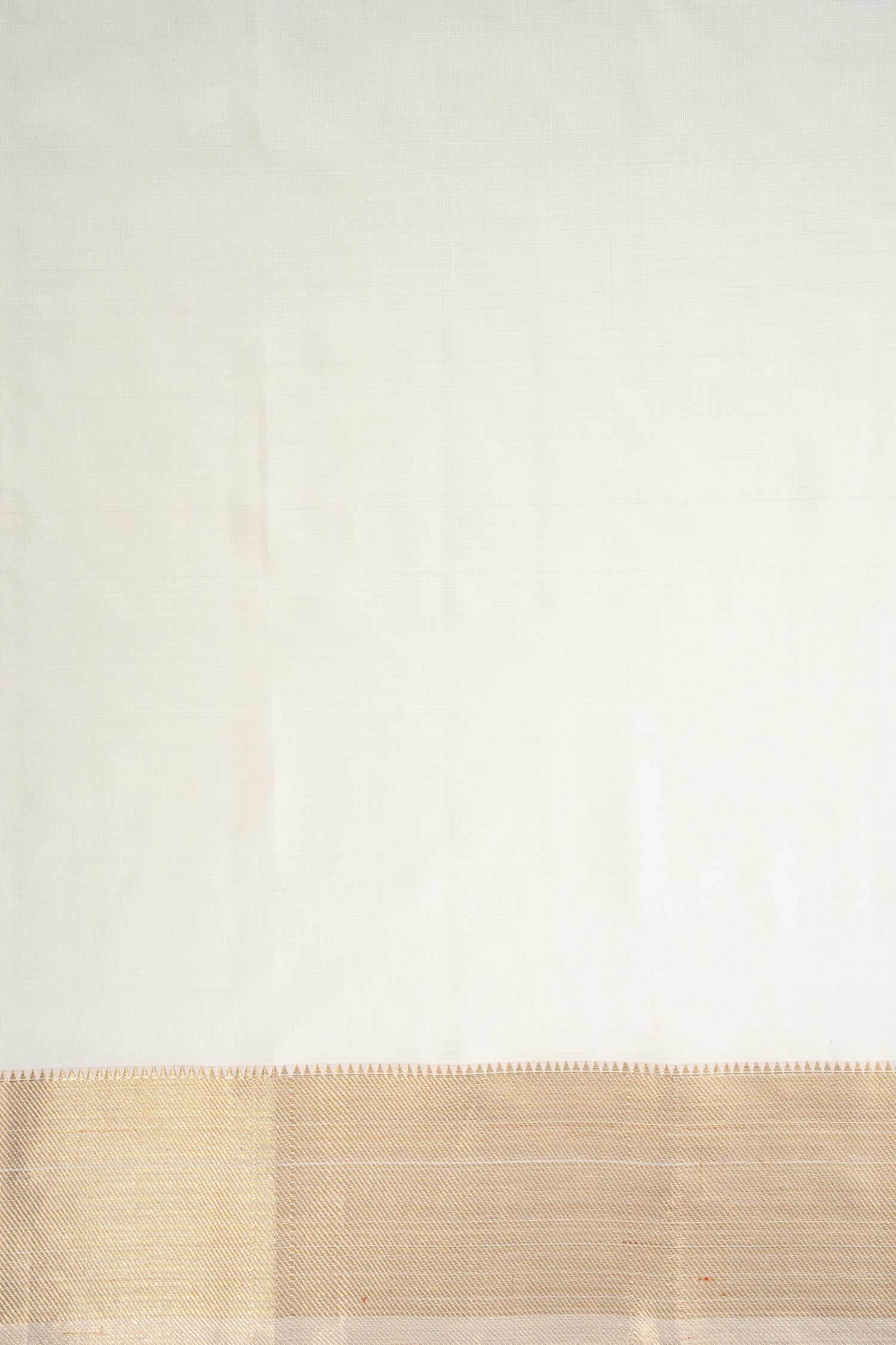 An ethereal off-white, wrapped in the richness of heritage. This saree carries an effortless elegance, its rich pallu glowing with refined sophistication.