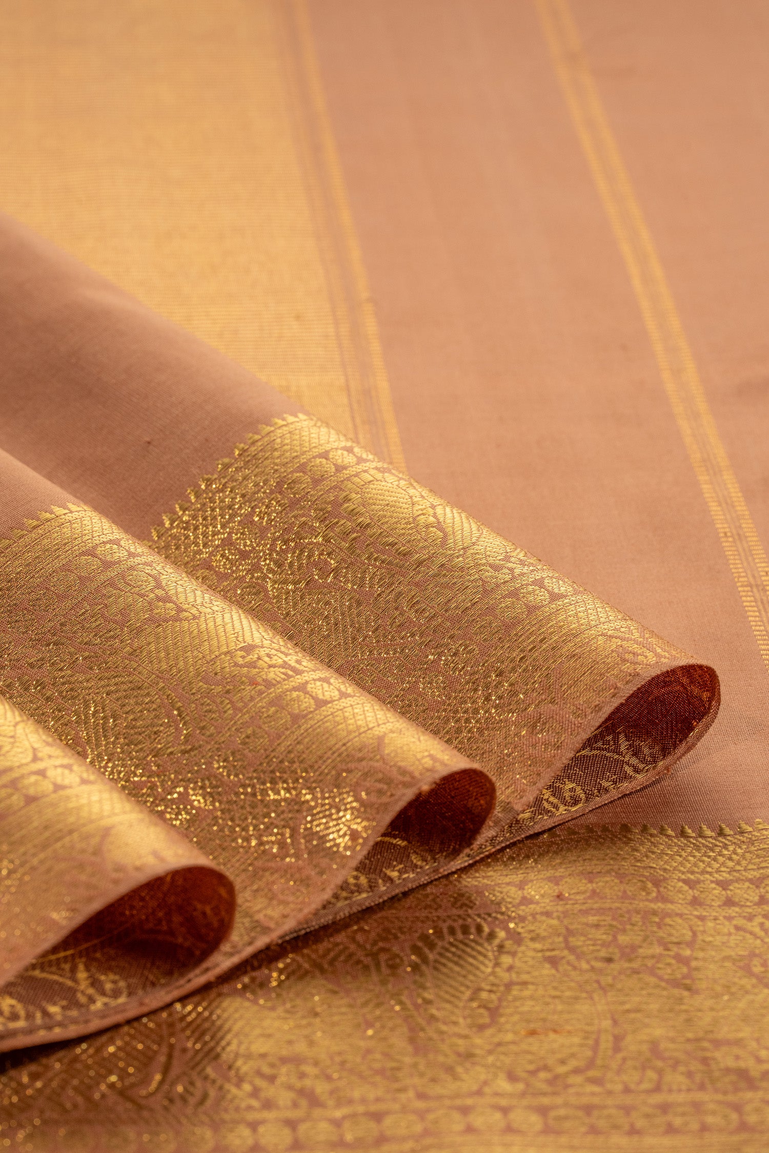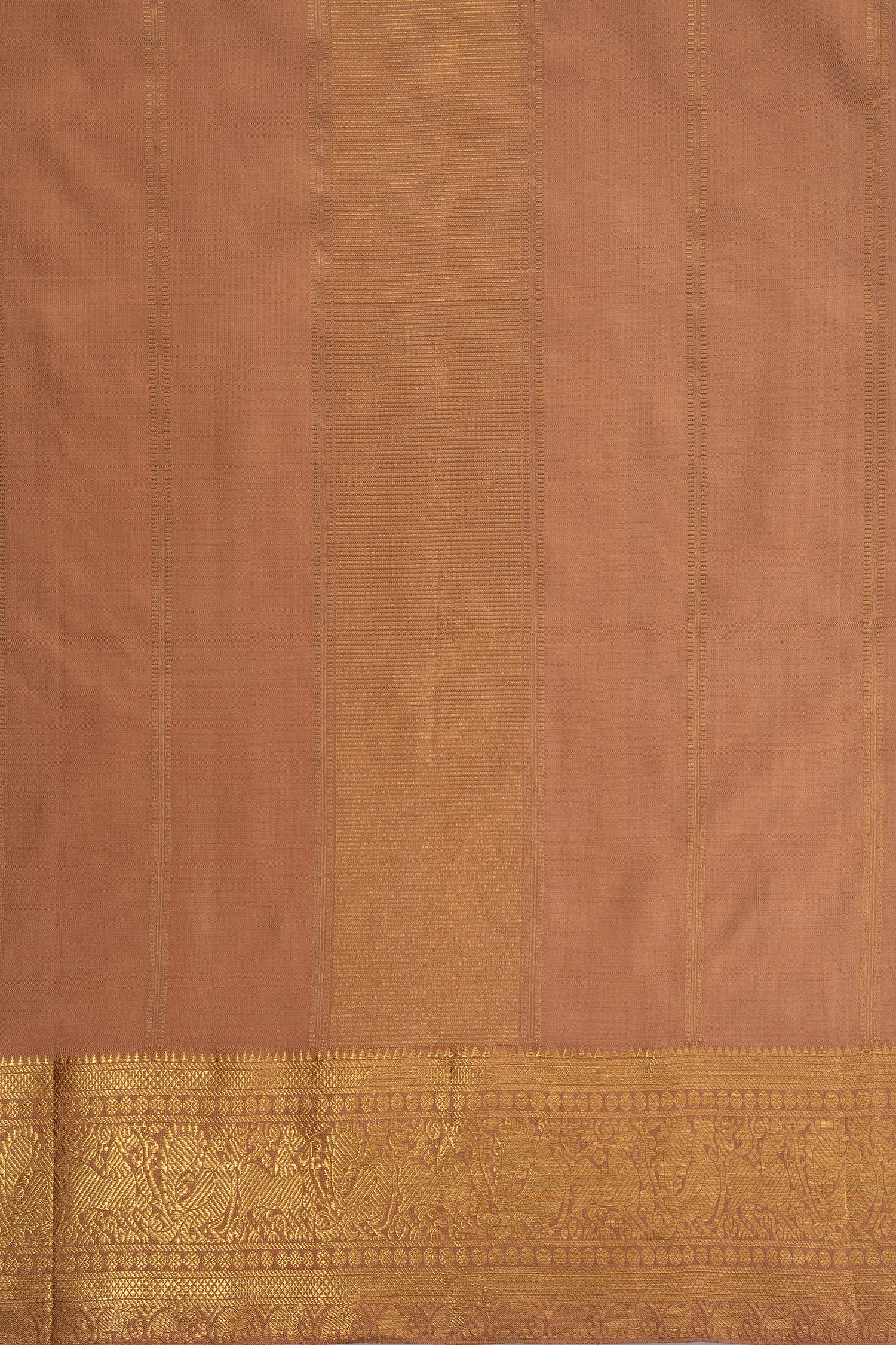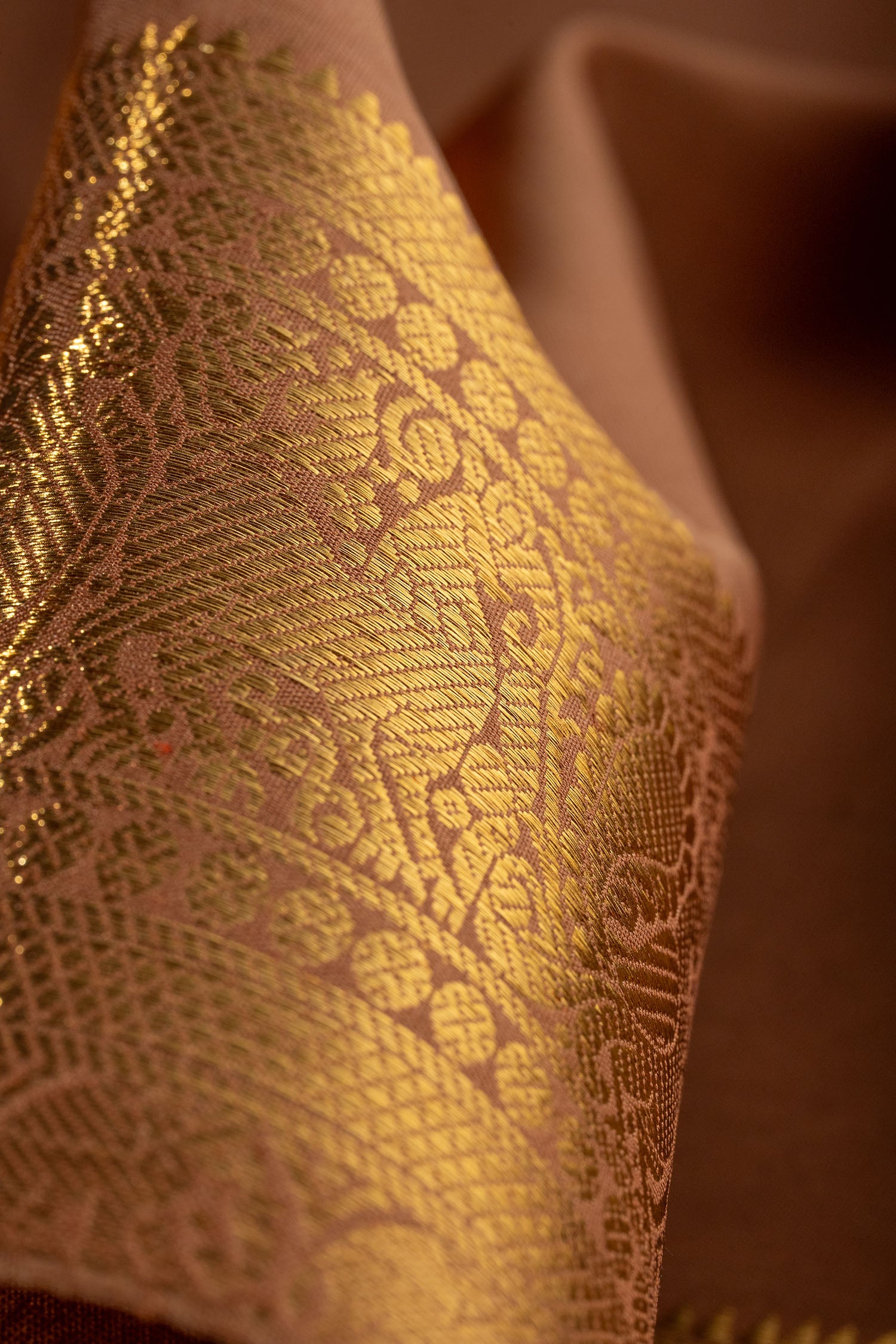 In a vintage brown that exudes heritage, this saree is a masterpiece of time-honored weaving. The rich pallu, enhanced with fine zari detailing, ensures an opulent yet understated presence.