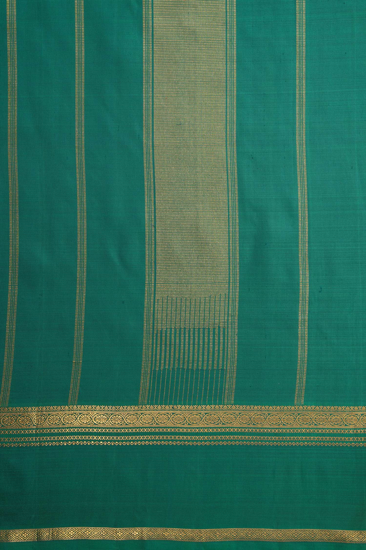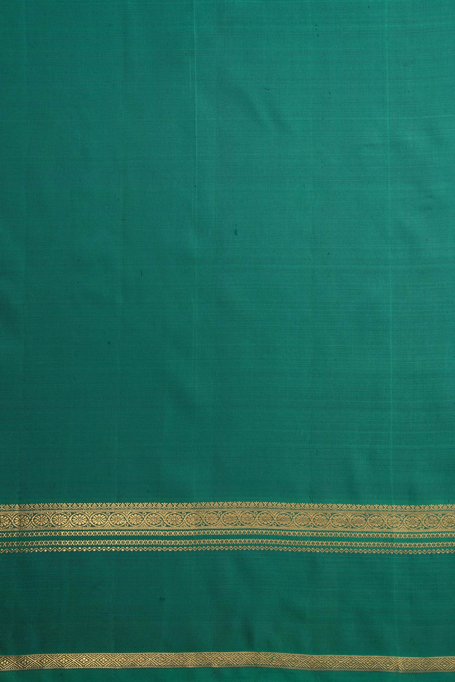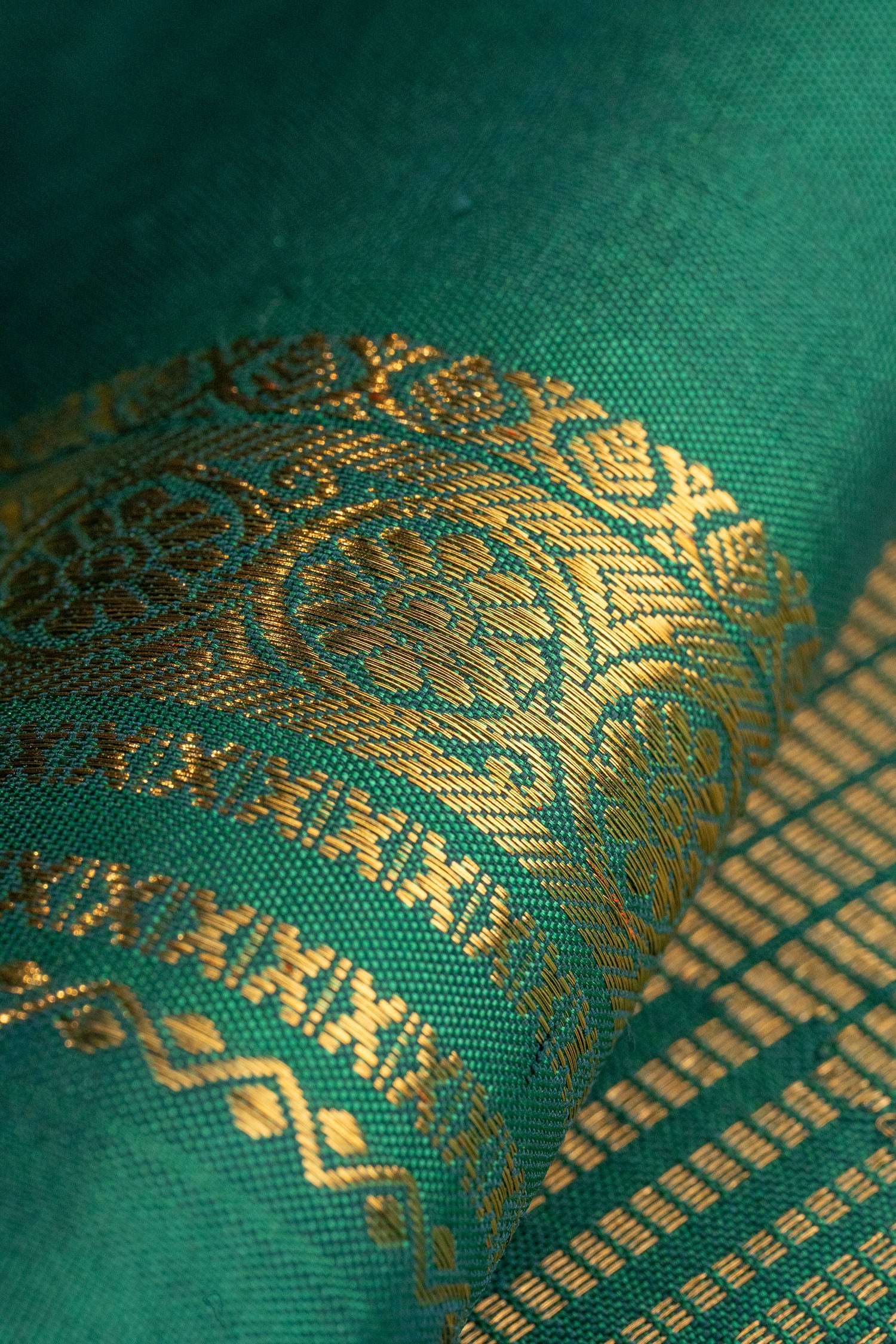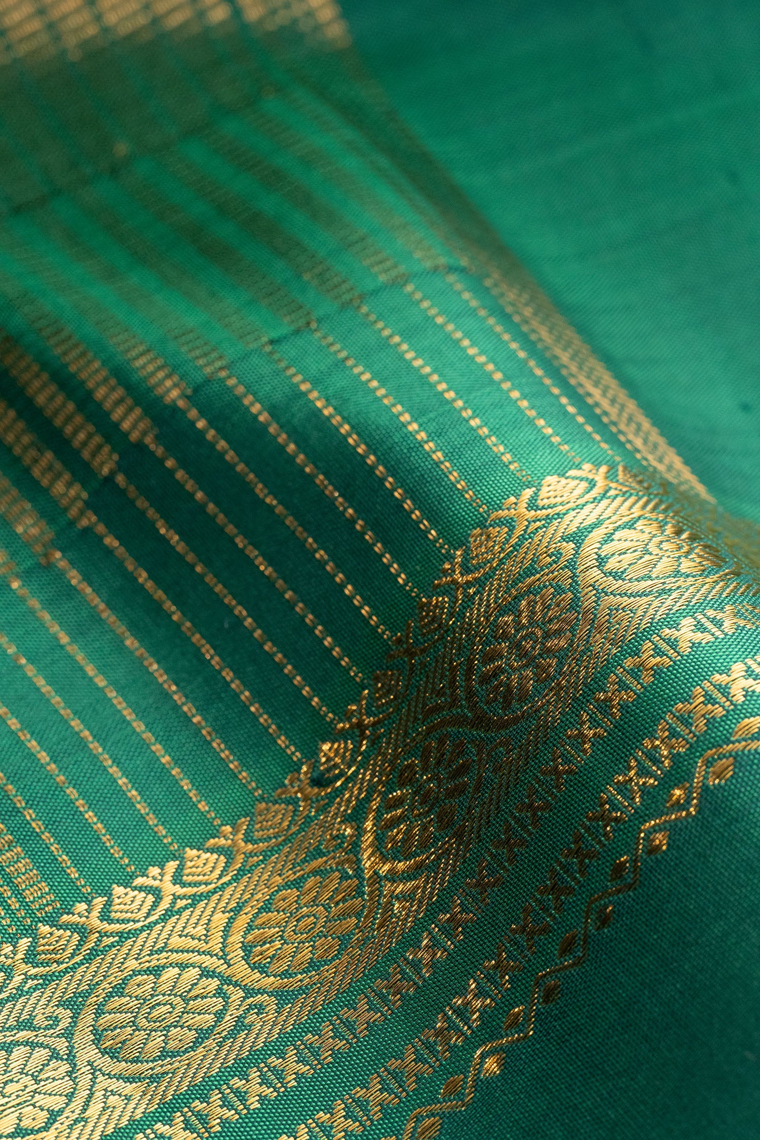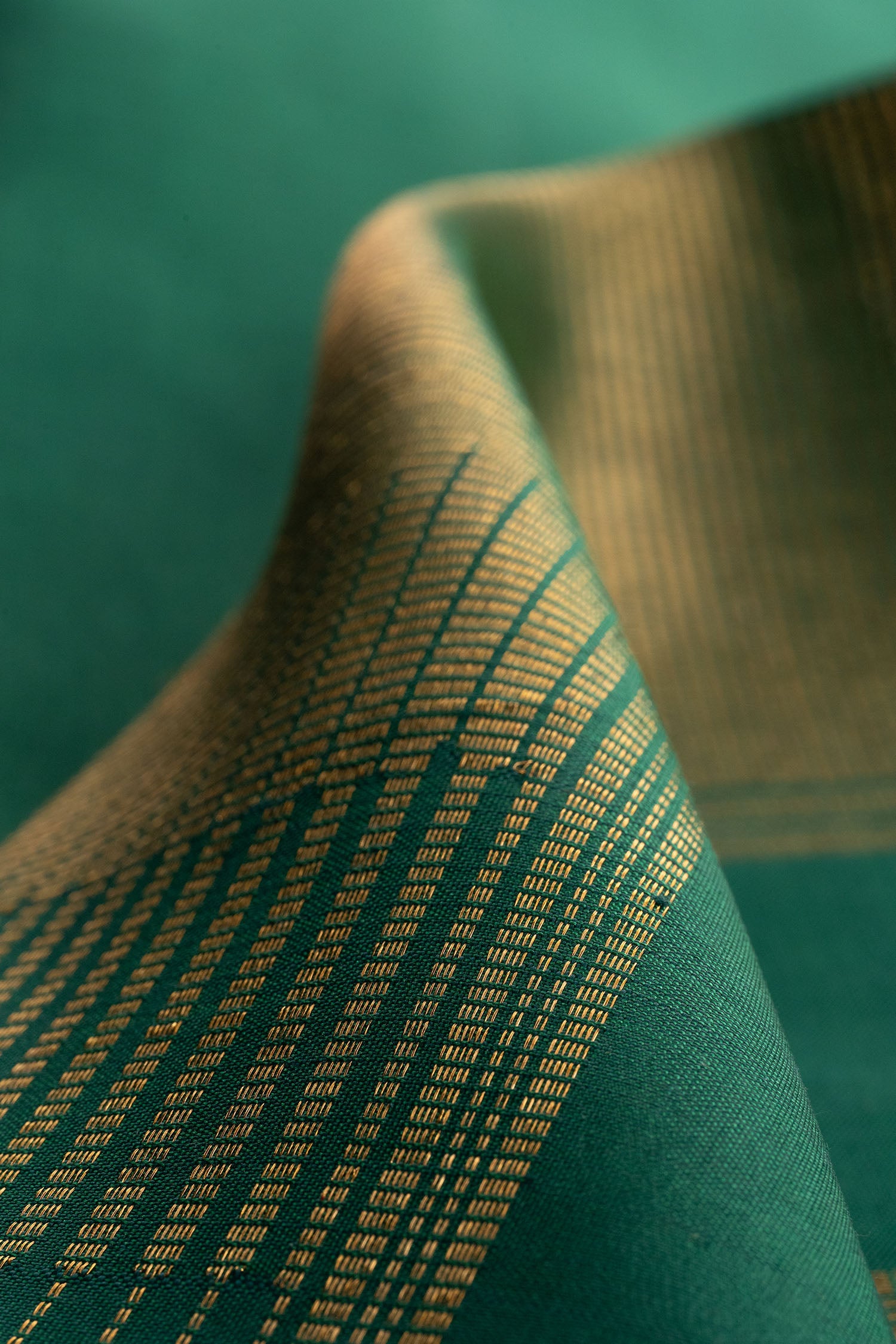 A serene green shade—this saree embodies growth and renewal. The intricate thin and thick borders, featuring motifs in golden zari, reflect a timeless elegance that’s perfect for grand celebrations.