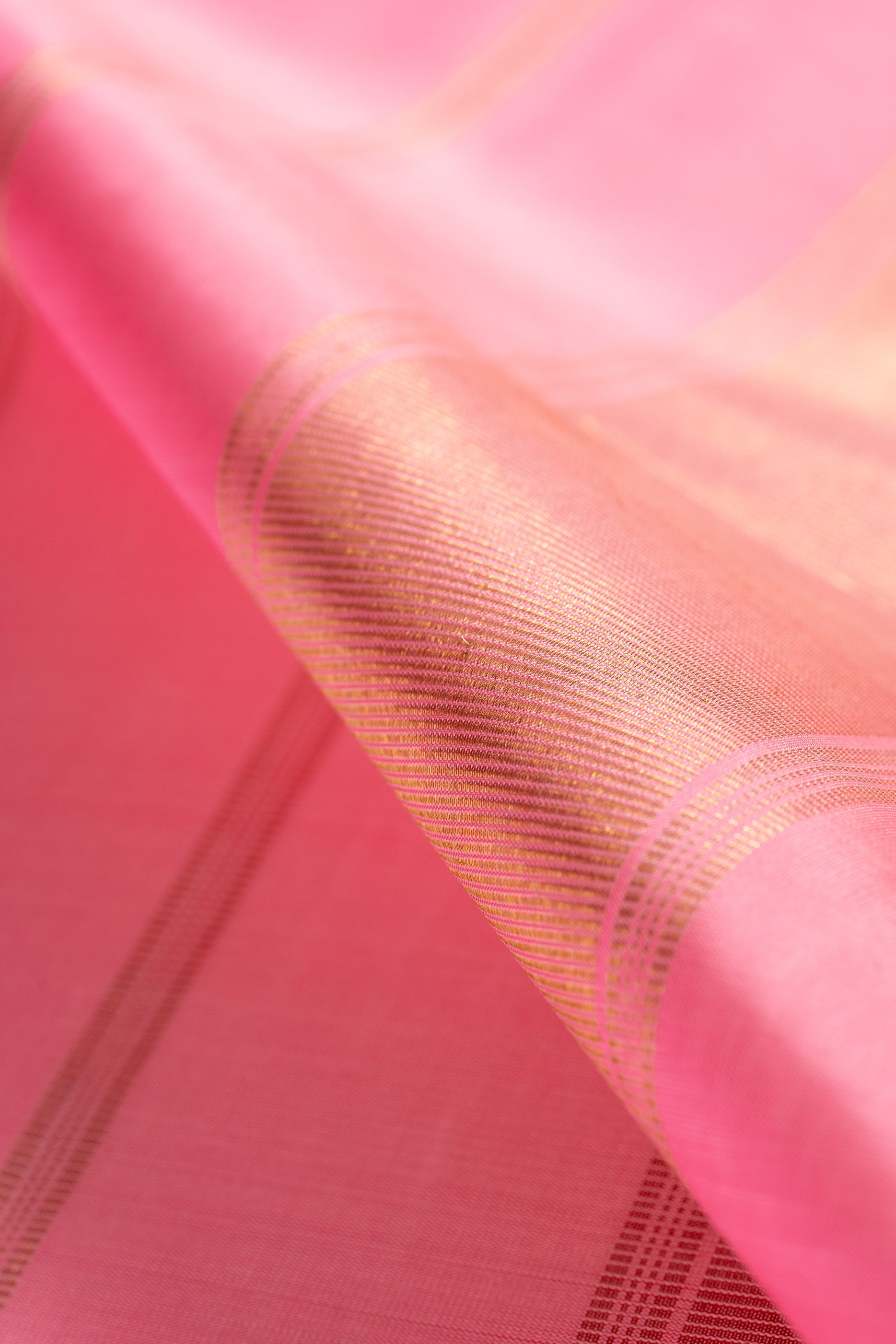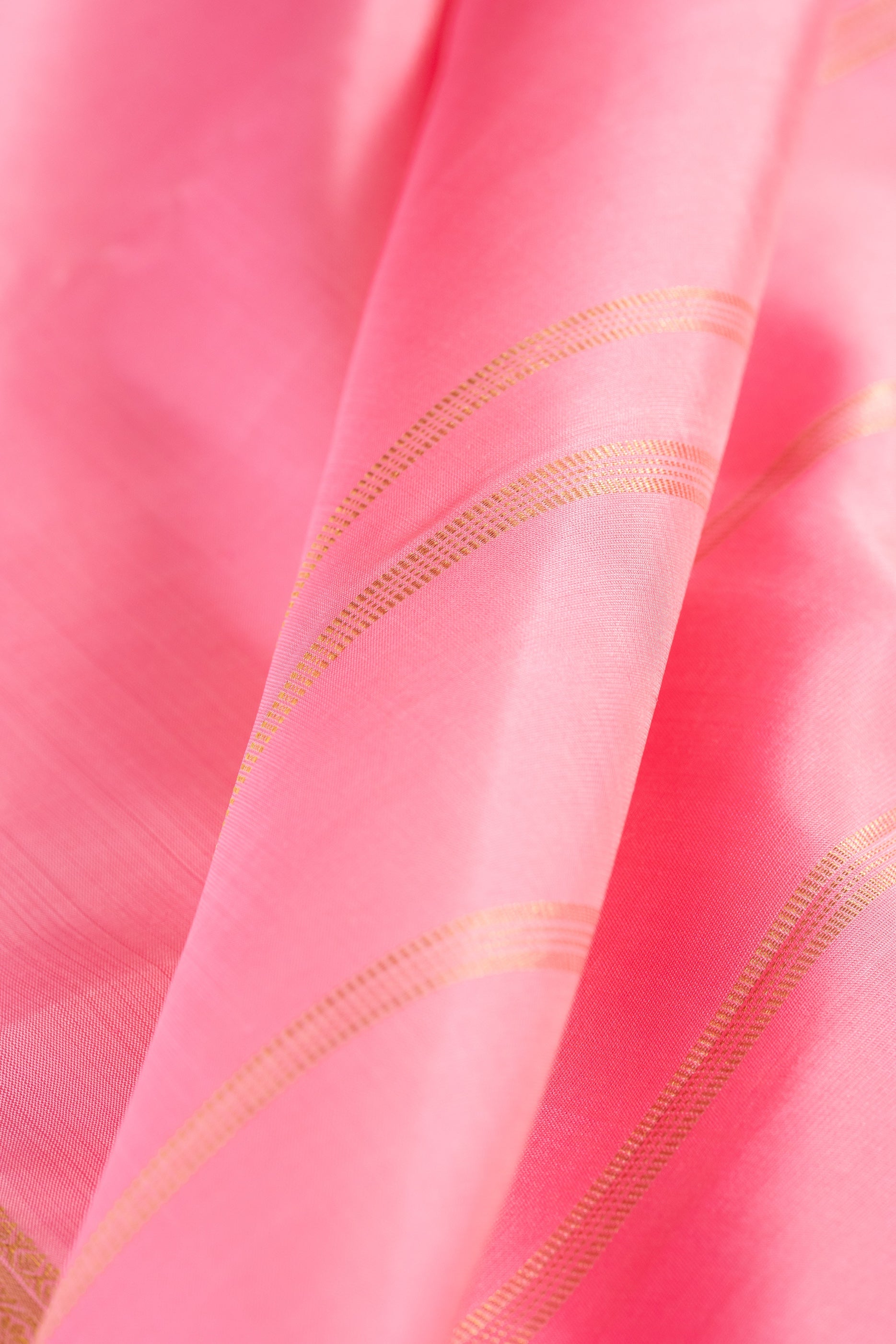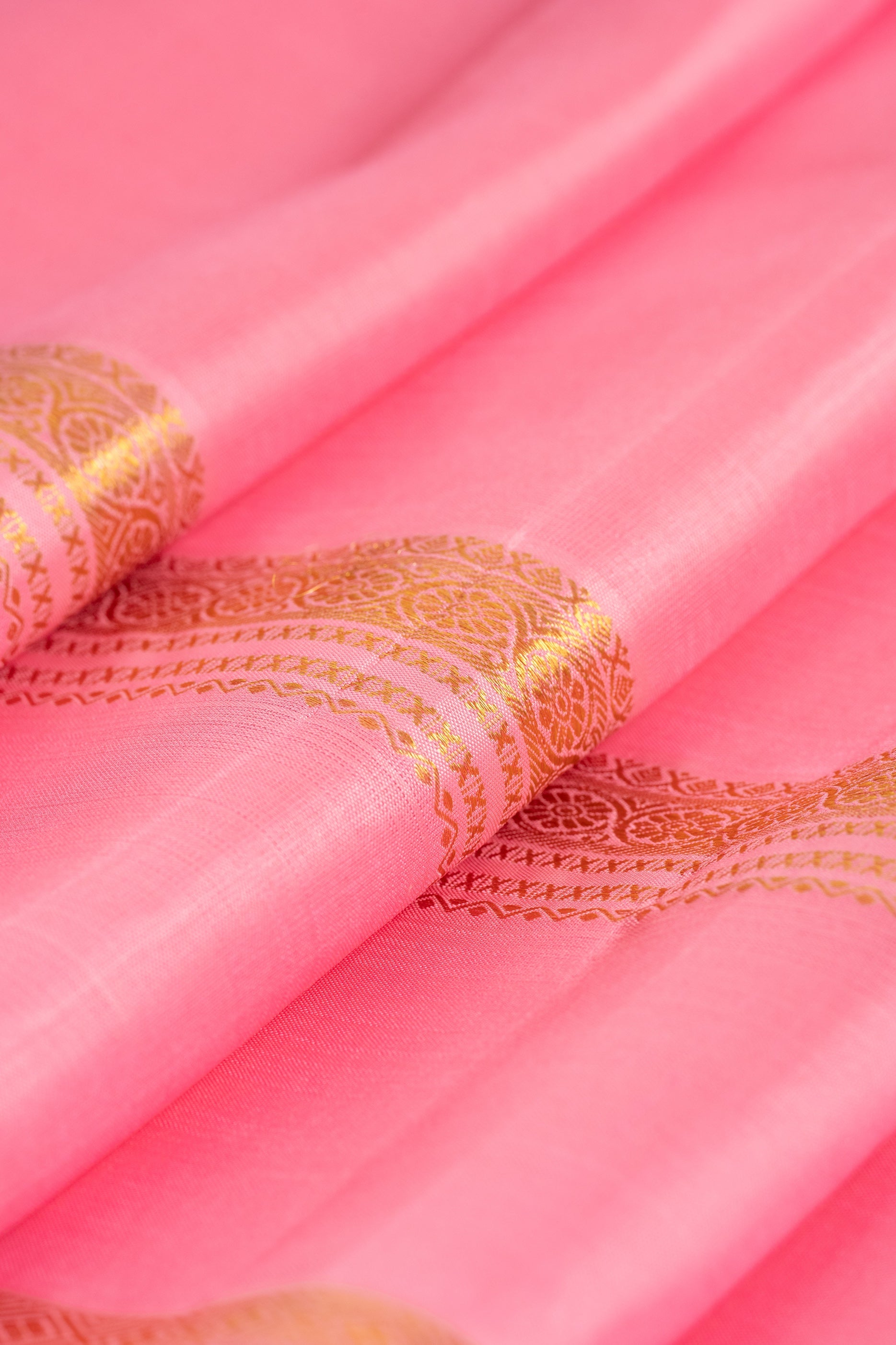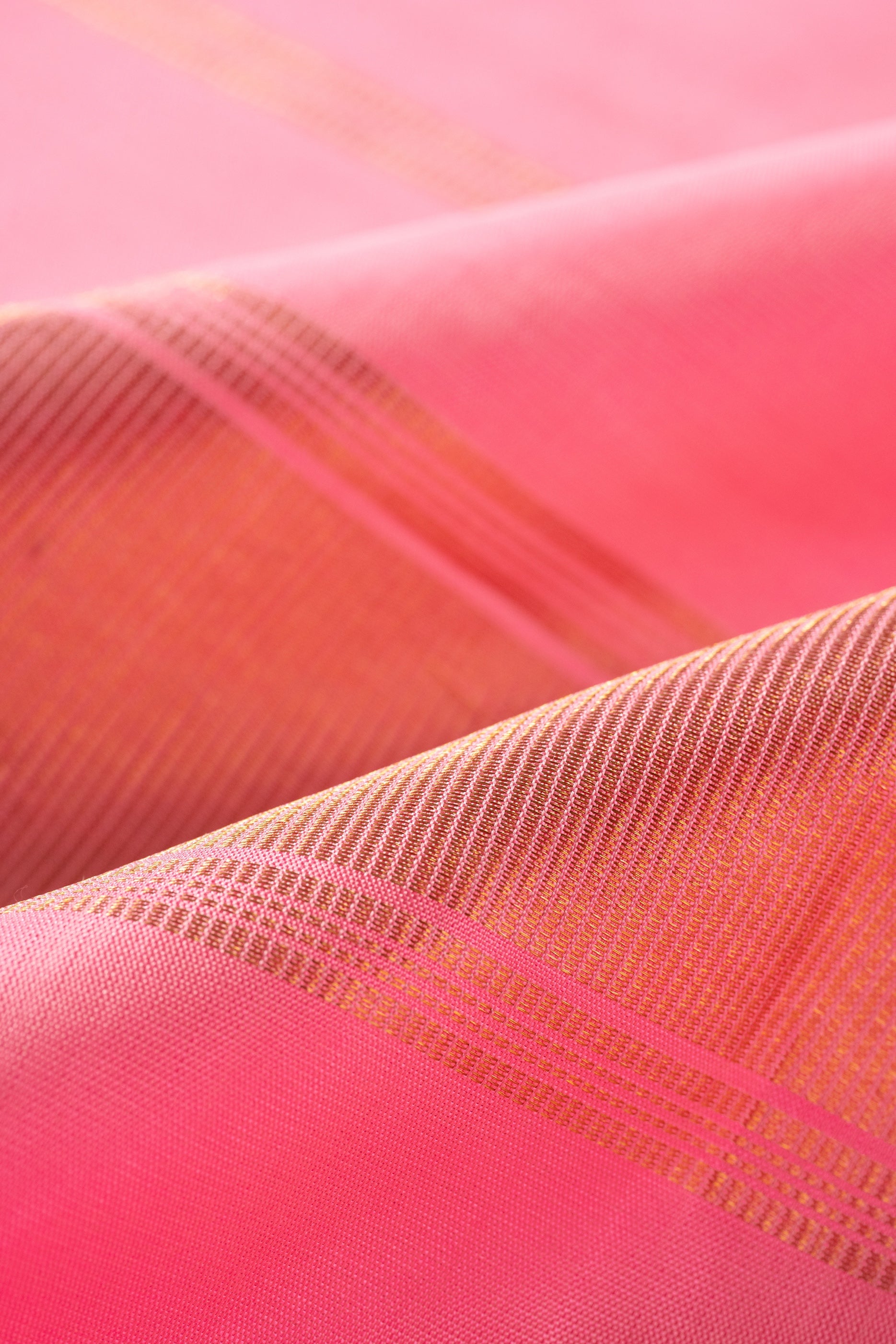 A vibrant pink, this saree exudes both grace and warmth. The thin and thick borders, adorned with golden zari motifs, elevate its beauty, making it the perfect choice for grand celebrations. The rich silk fabric drapes effortlessly, while the intricate zari work adds a luxurious touch that shines through any gathering.