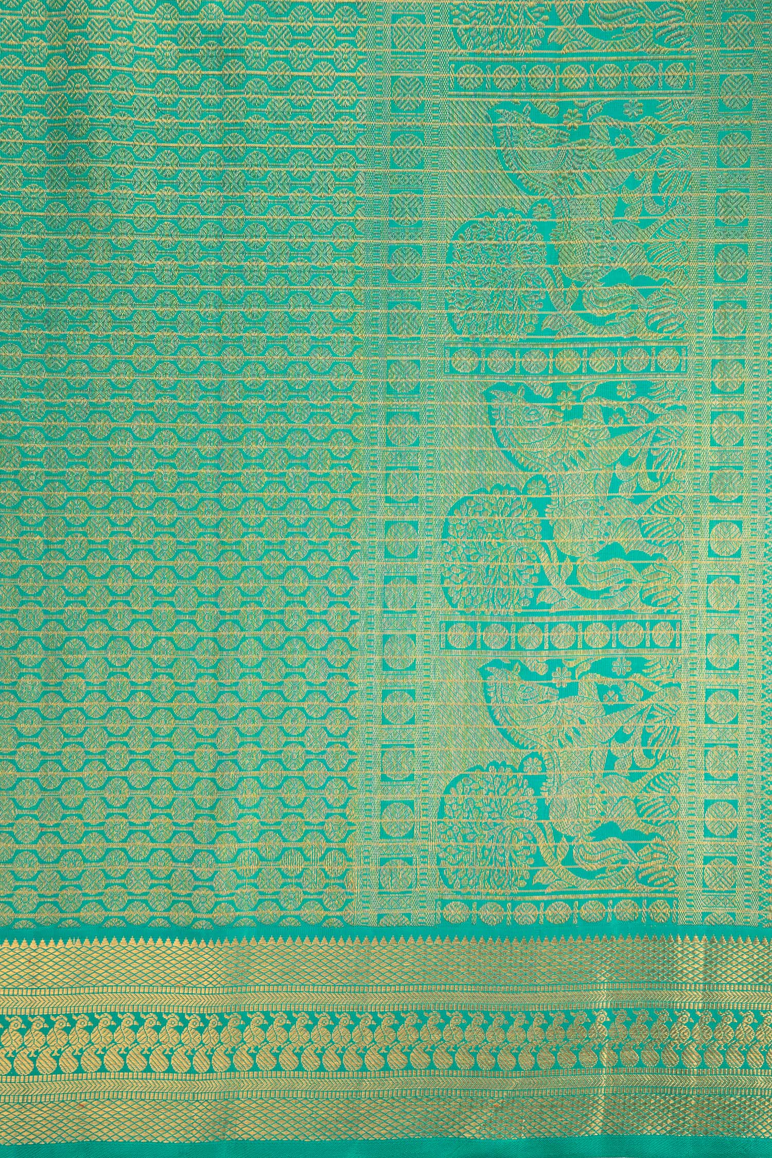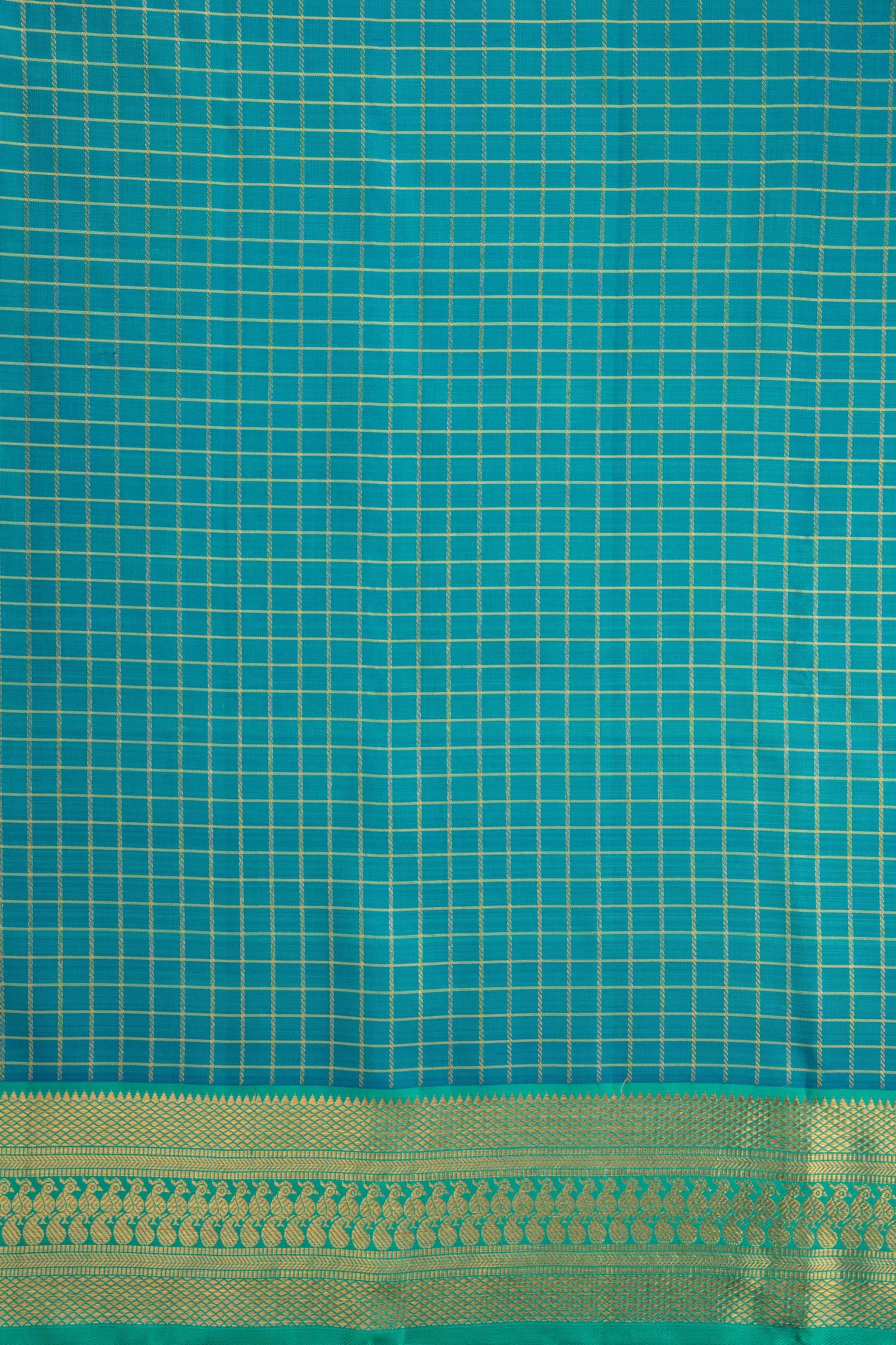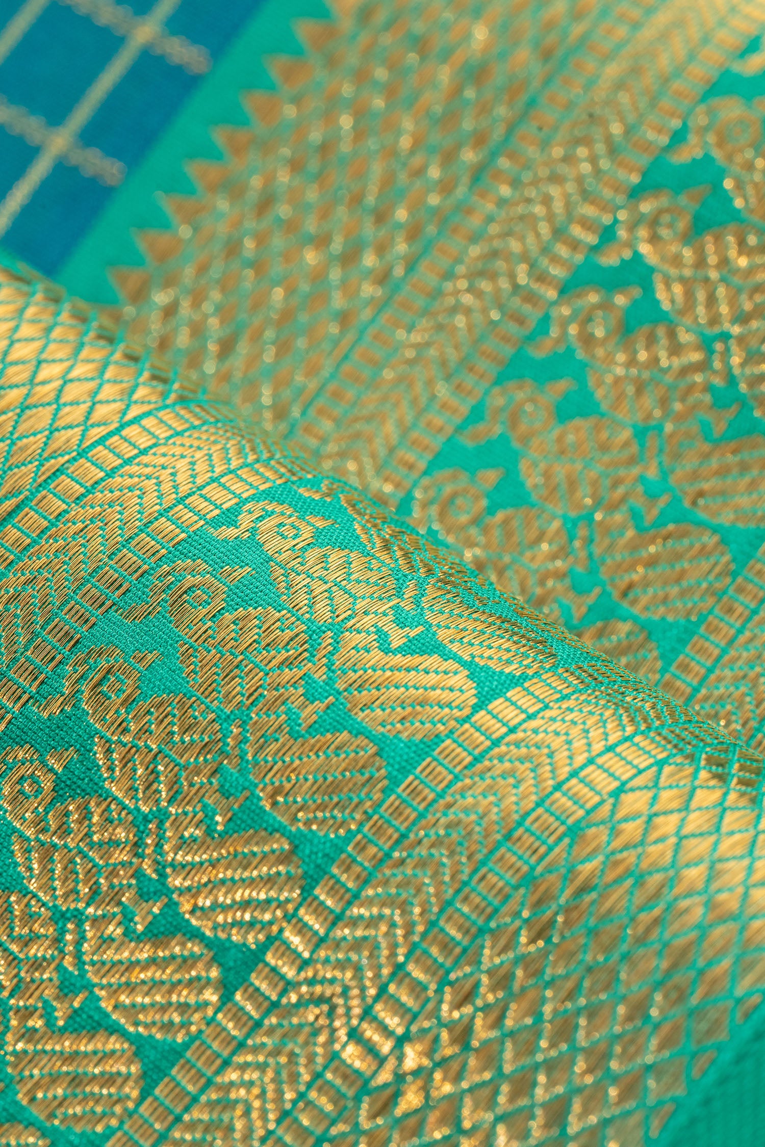 Woven in the Muthukattam Korvai style by two skilled weavers, the saree features a body full of zari checks and a rich pallu. With a silk weight of 900 gm and Gold zari weight of 300 gm, it drapes with grace, making it perfect for moments that matter most.