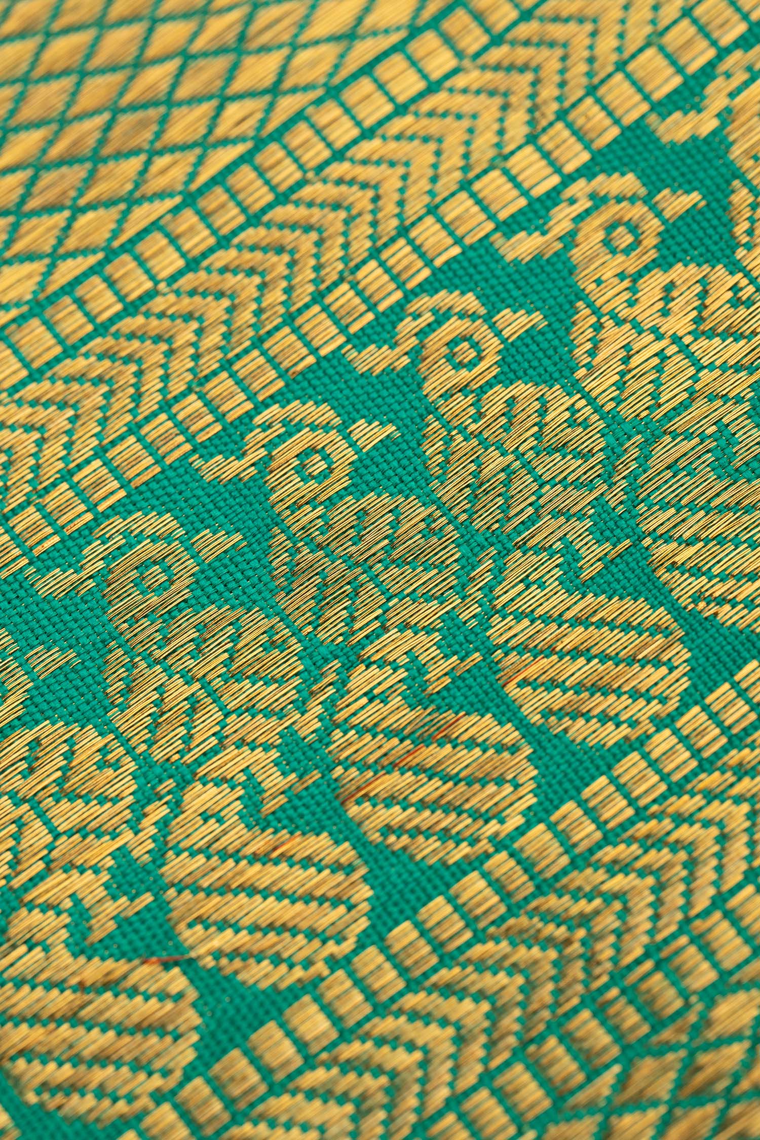 In serene green tones, this saree reflects the peace and harmony of nature, offering a moment of calm amidst the celebrations. Its soft yet vibrant color speaks of timeless beauty and elegance.