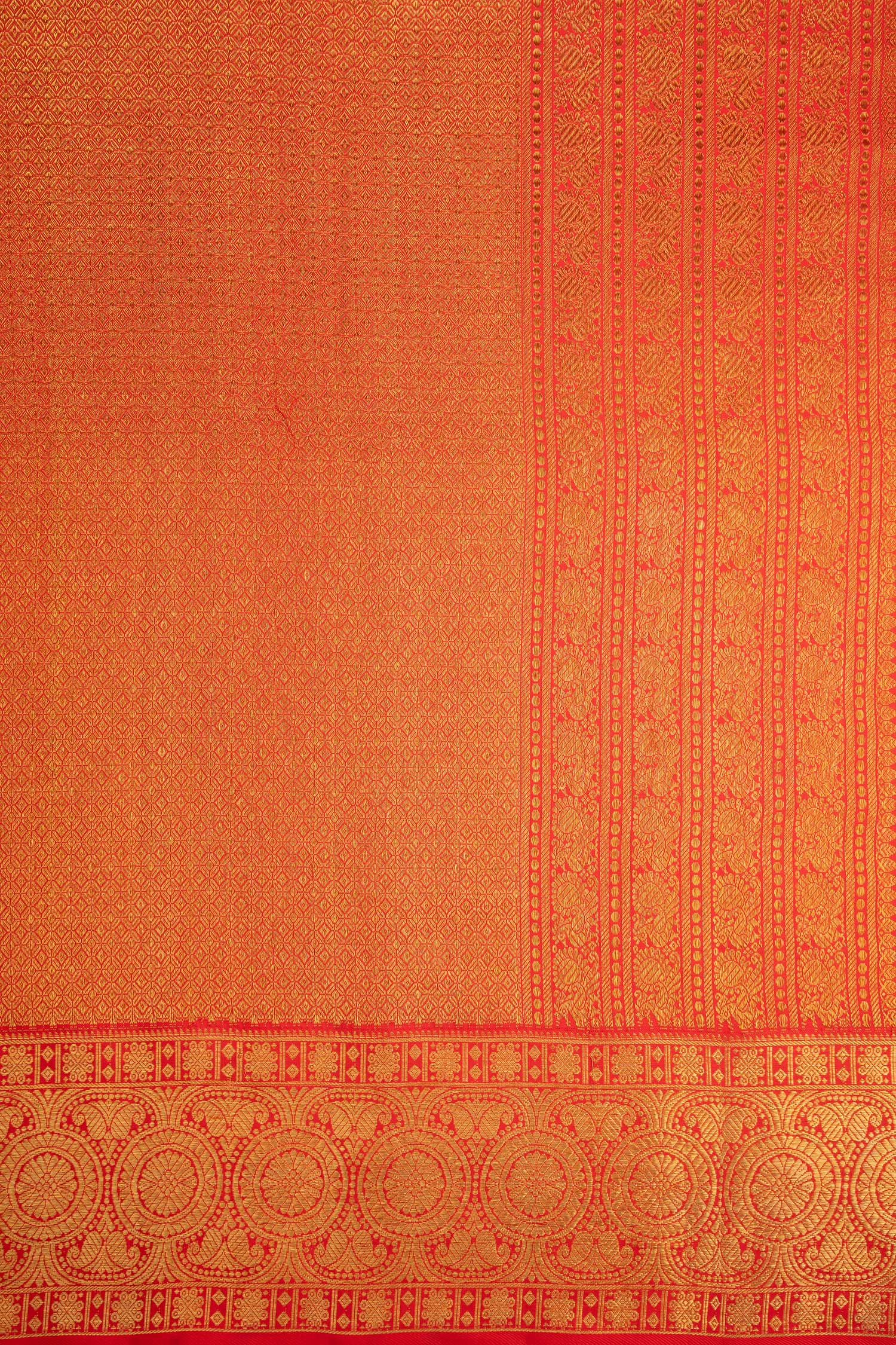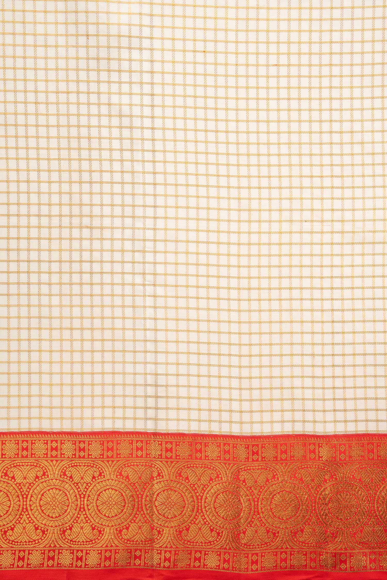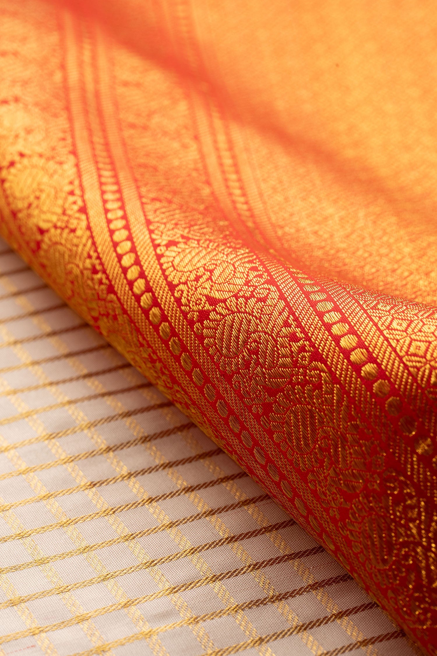 Crafted by two weavers in the Muthukattam Korvai tradition, the saree features a body full of zari checks and a rich pallu, with contrasting borders and body colors. The silk weighs 900 gm and the Gold zari weighs 300 gm, creating an elegant drape that feels both luxurious and effortlessly graceful.