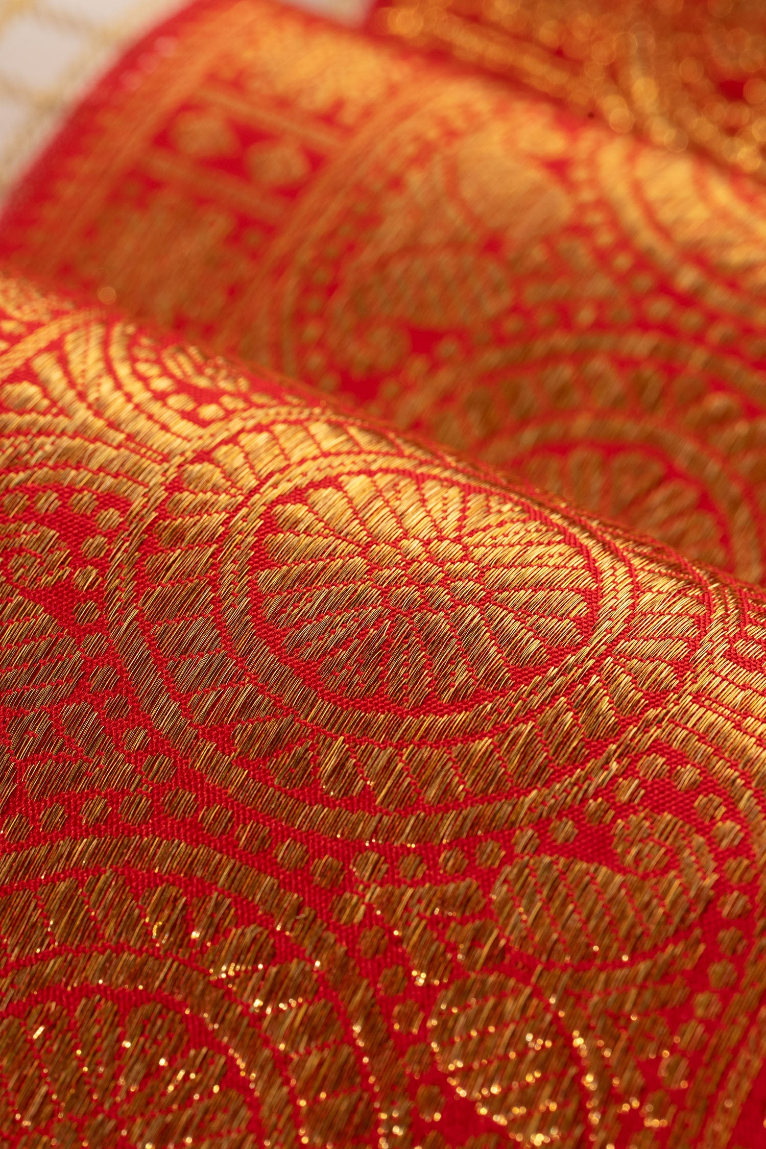 Soft cream and red tones blend seamlessly, telling a story of purity, tradition, and joy. This saree evokes the beauty of celebrations and the warmth of moments shared with loved ones.