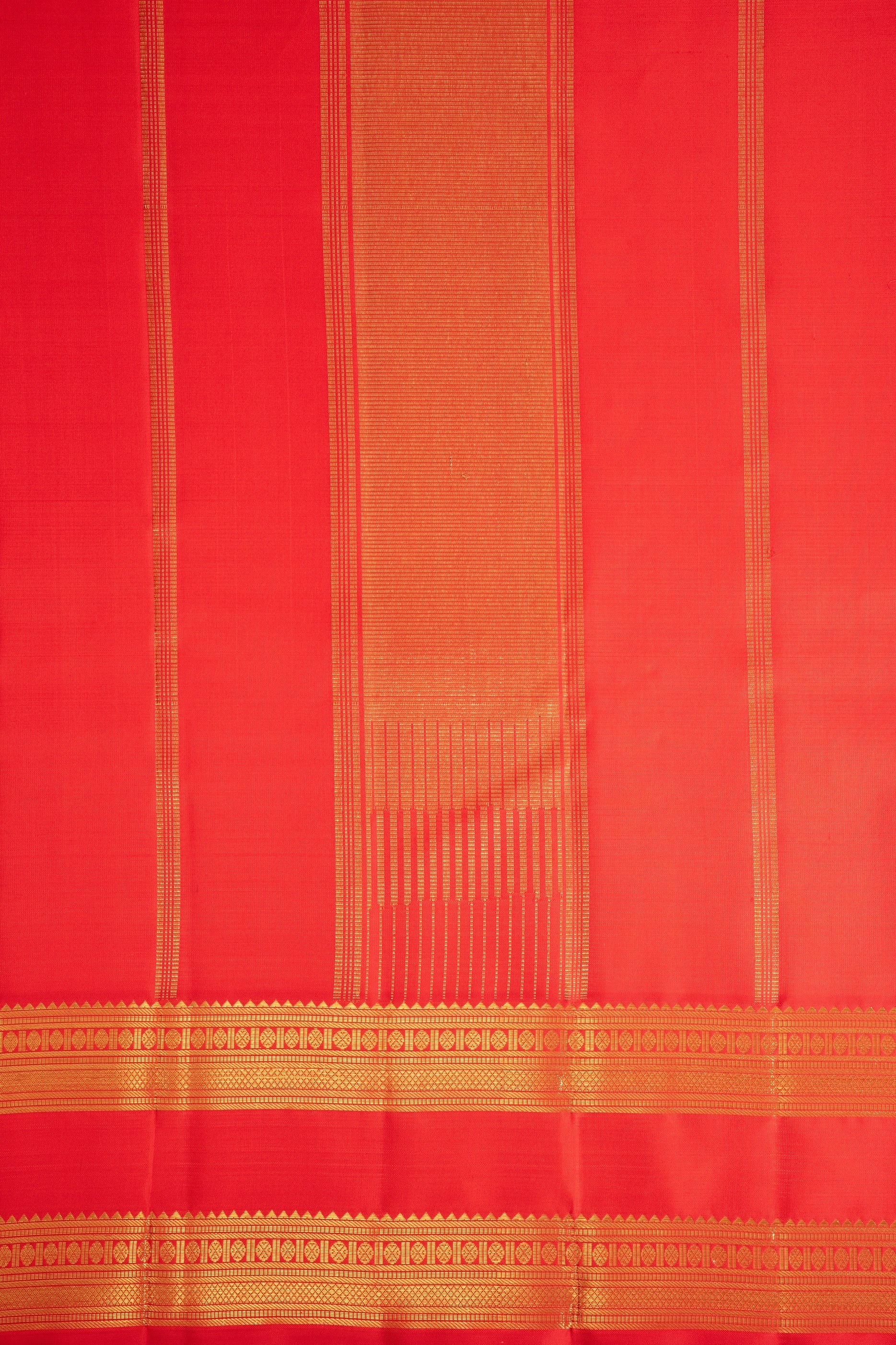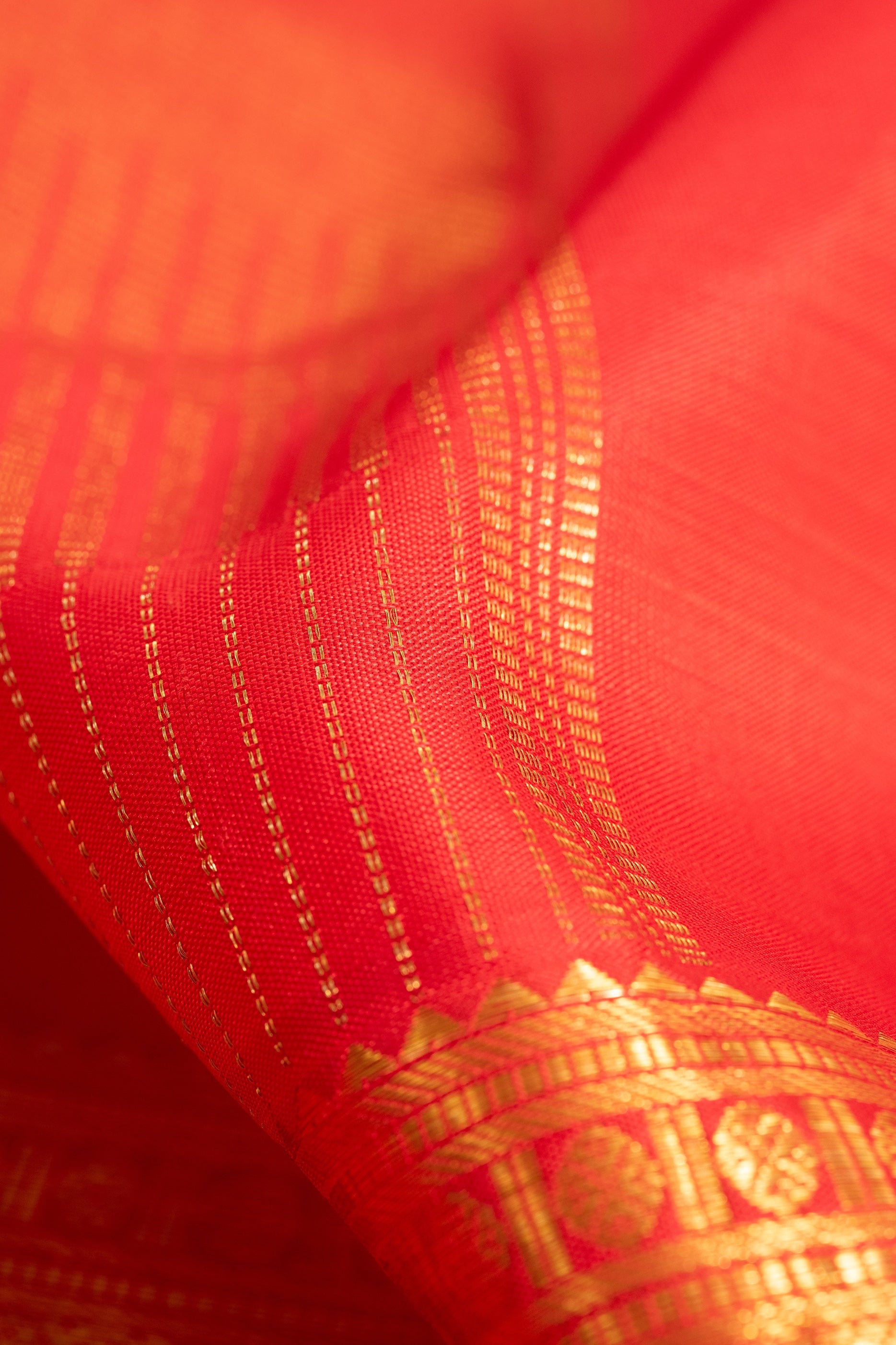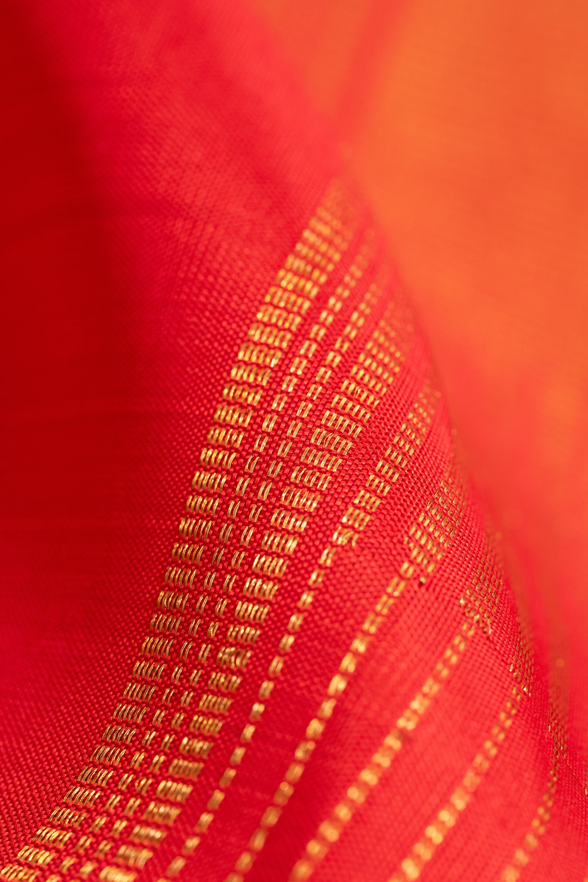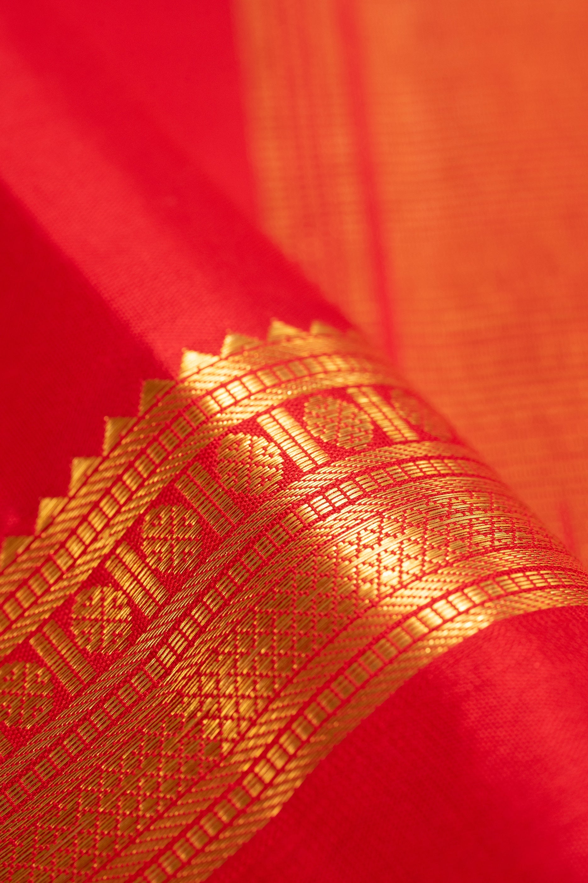 A bright red that commands attention—this saree brings together tradition and boldness. Its striking color and intricate design create a captivating effect, while the thin and thick borders with motifs in golden zari add a sophisticated touch.