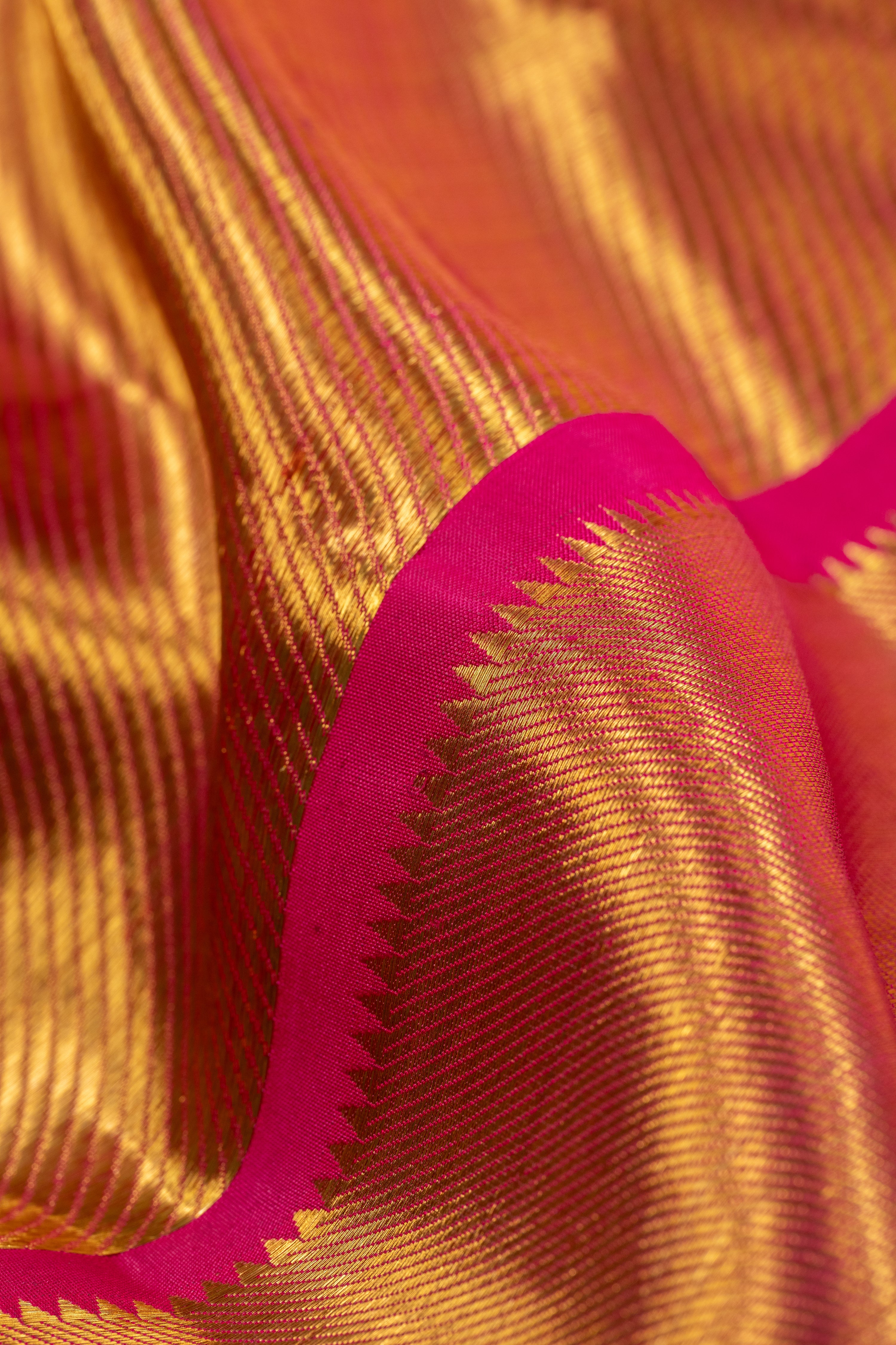 A vibrant fuchsia pink saree, crafted with twill weave weaving, giving it a distinct texture and sheen. The rich pallu, accentuated with 750 gm of Gold zari, adds a luminous touch, while the fabric’s 1 kg 100 gm weight ensures an elegant drape.