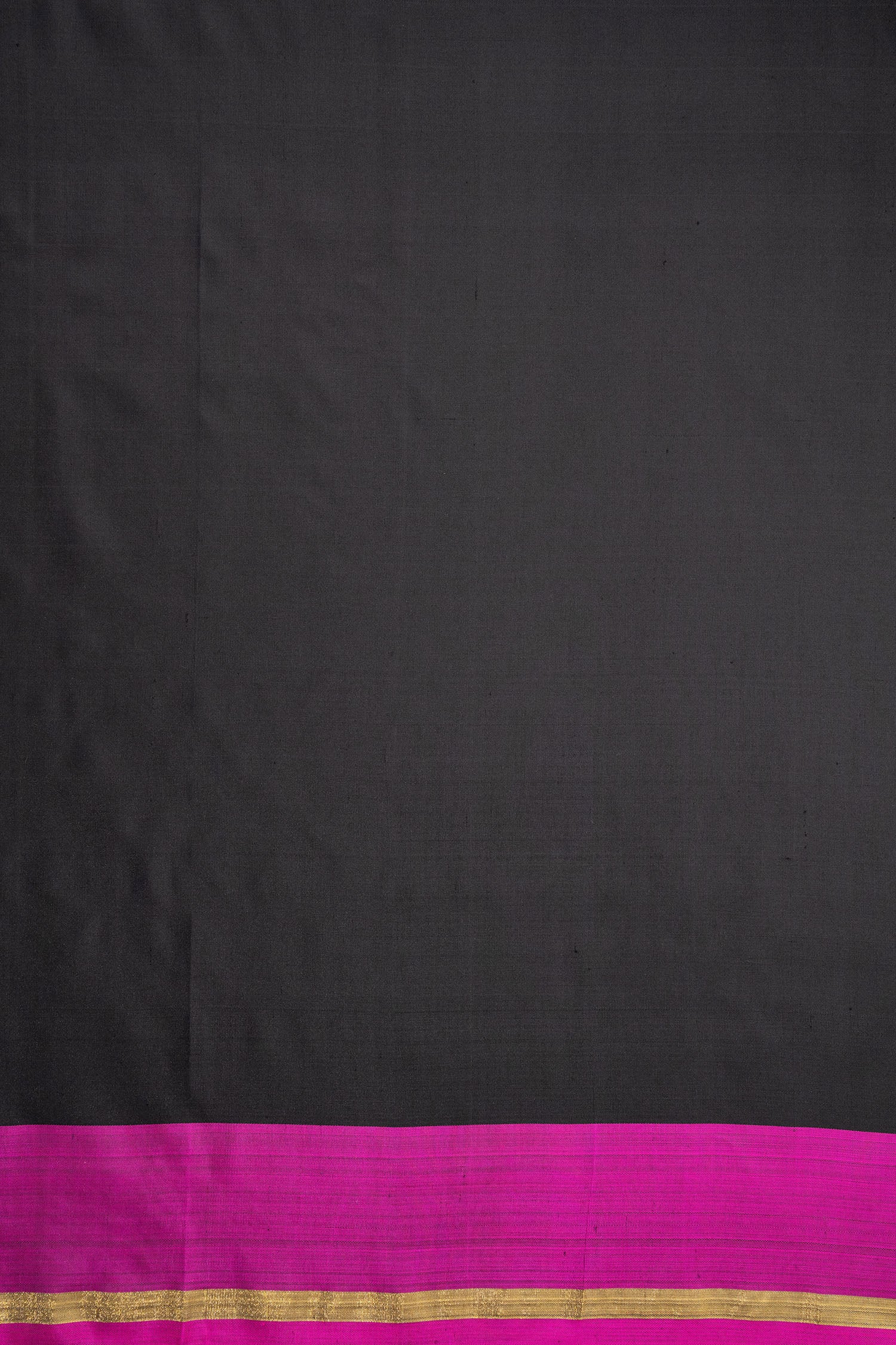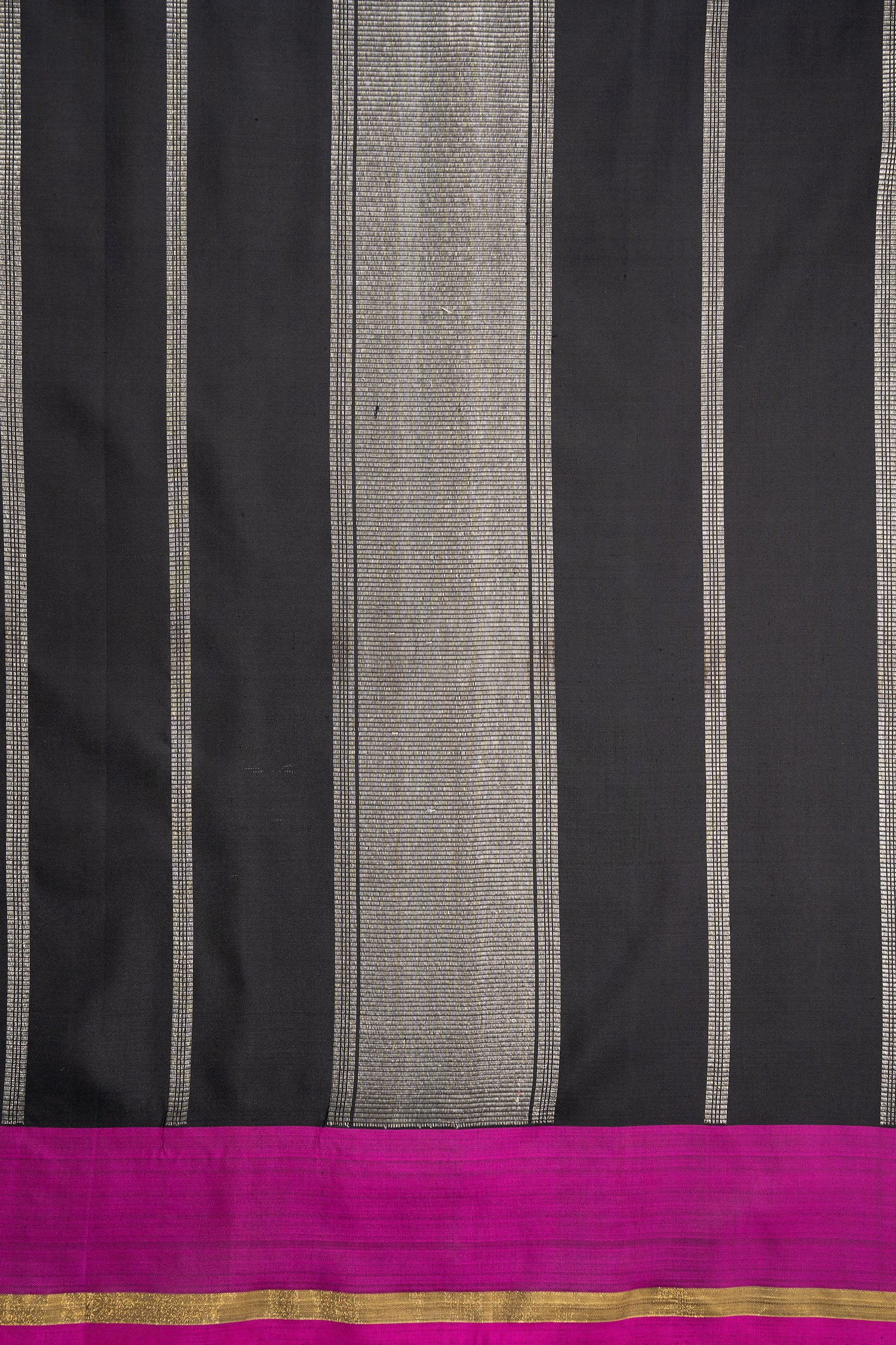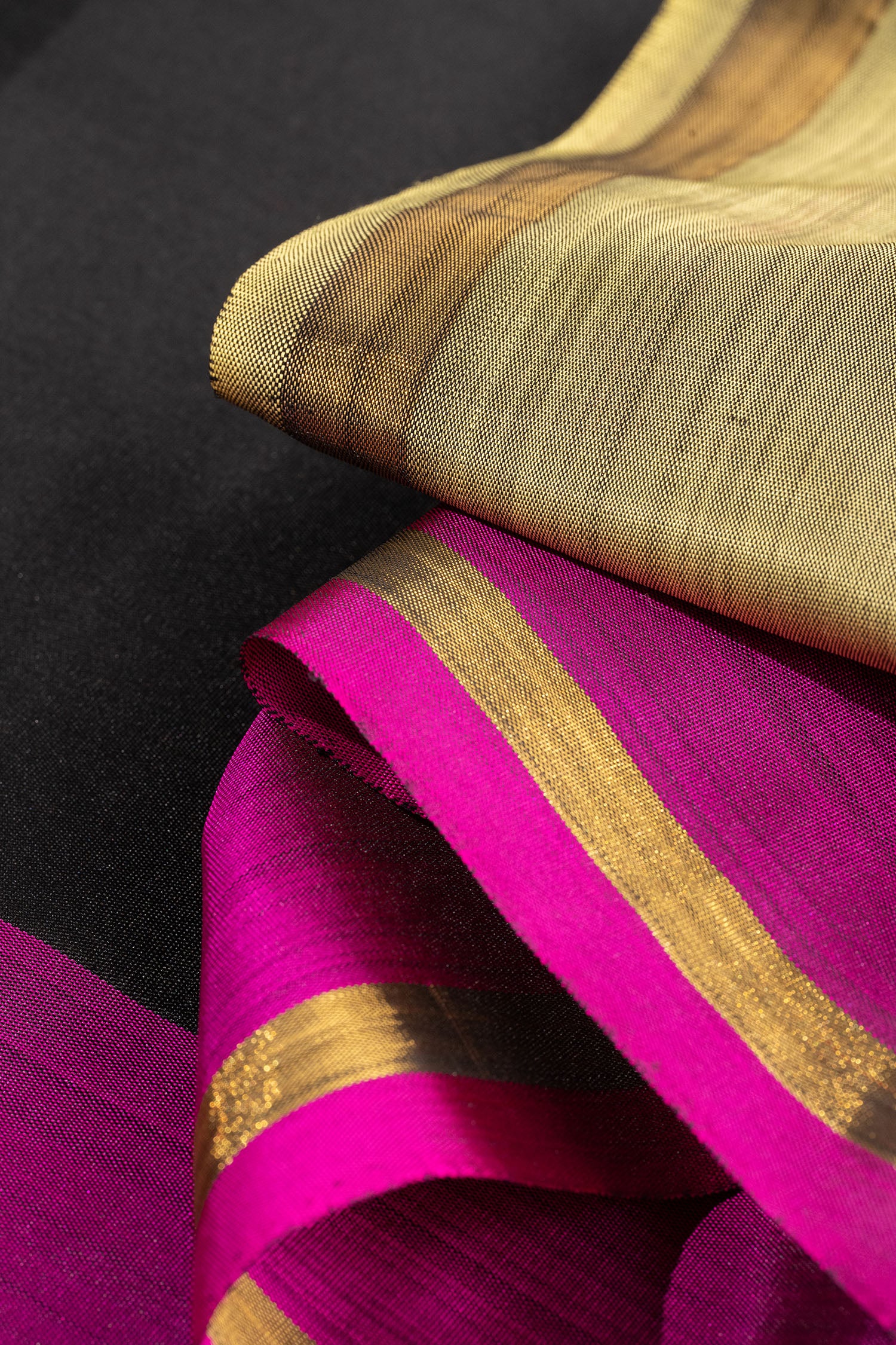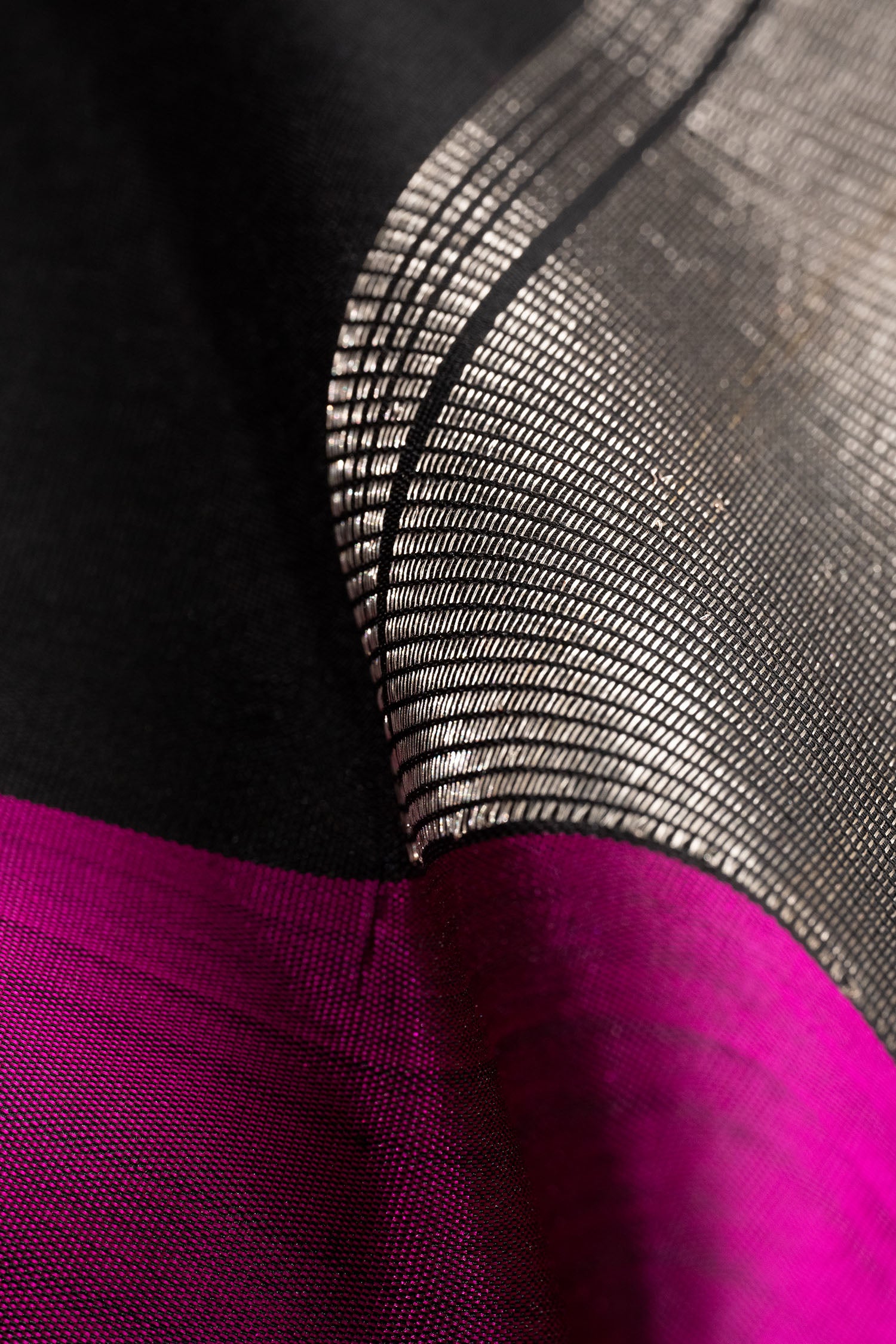 A bold combination of black, fuchsia, and green, this saree blends striking colors with a unique striped pallu and ganga-jamuna double borders. It offers a modern twist on the traditional Kanjivaram style, perfect for festive occasions.