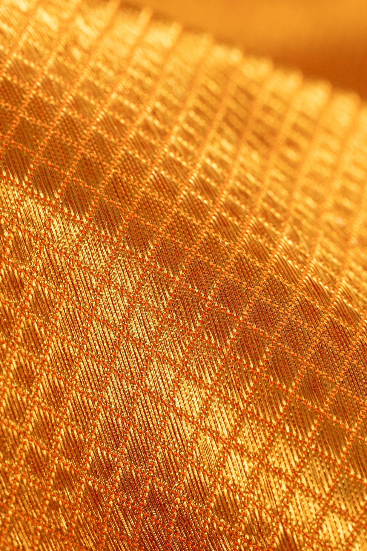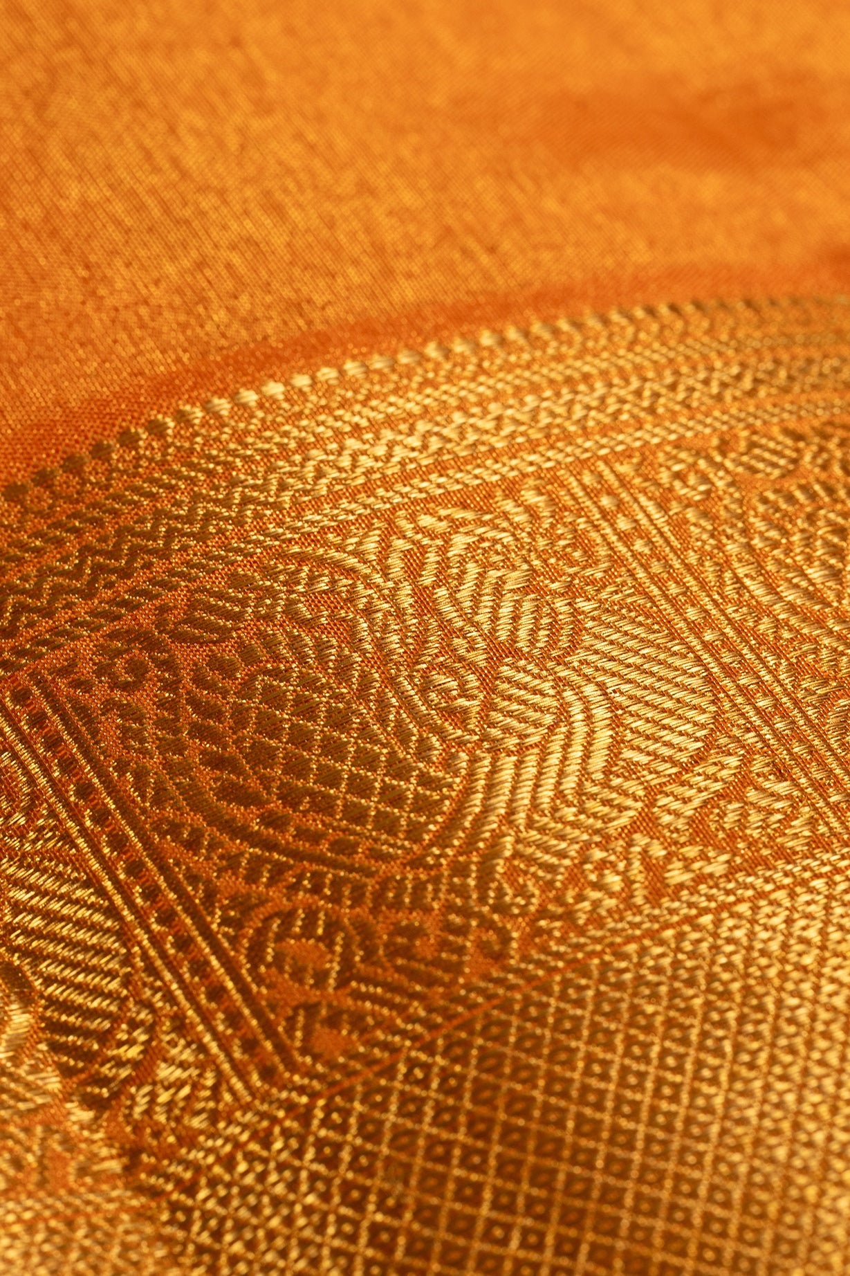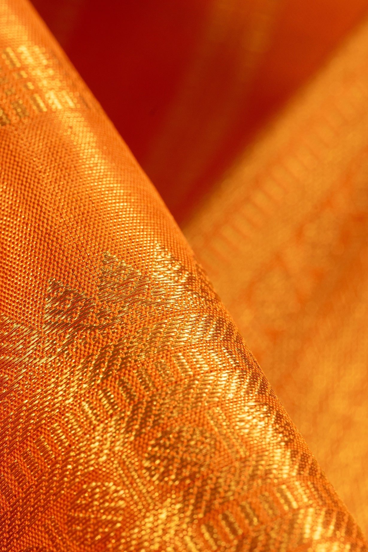 A luminous orange tissue saree, crafted to capture the radiance of golden hours. The rich pallu, adorned with fine zari work, enhances the opulence of this piece, allowing it to shimmer effortlessly with every movement.